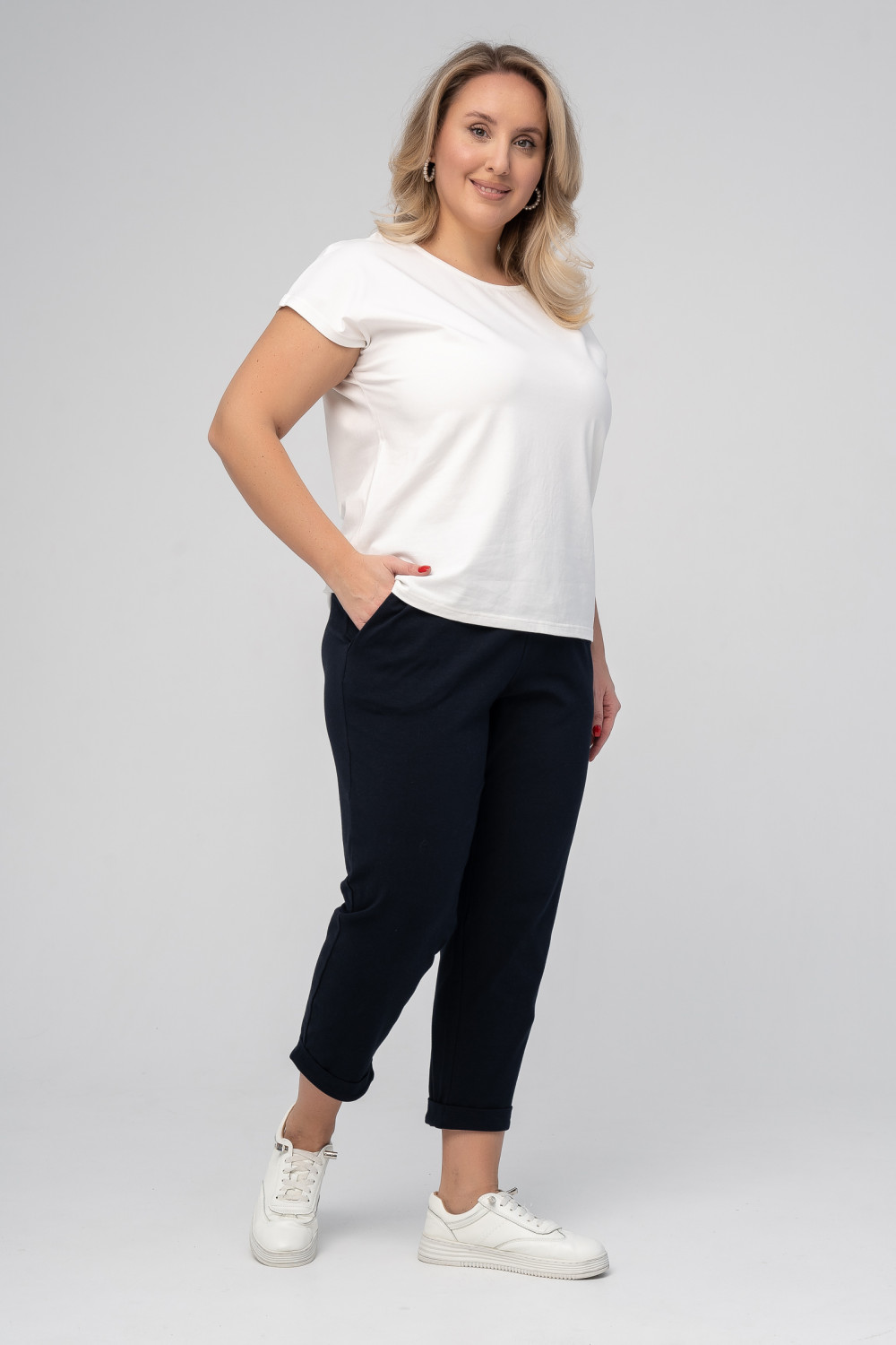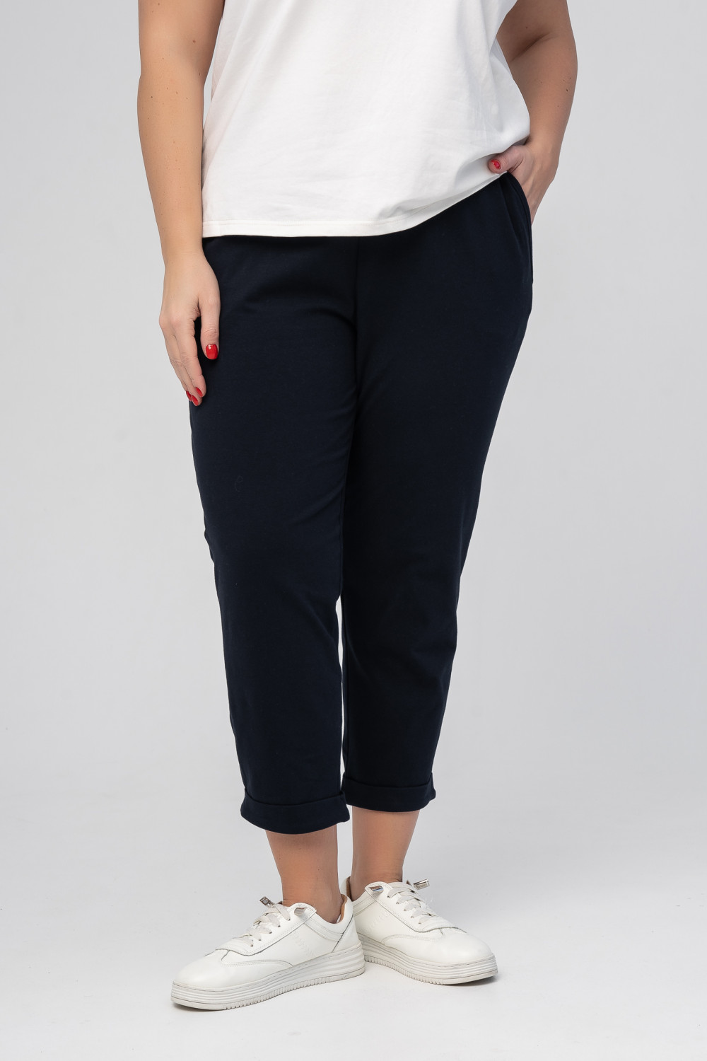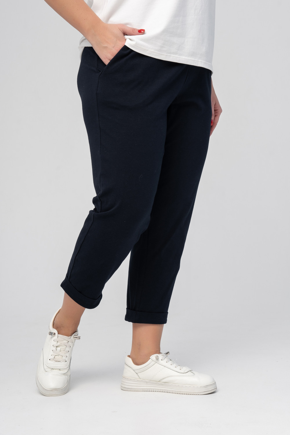 Лаконичные брюки из кулирки с лайкрой отличаются легкостью и комфортным прилеганием к телу. Мягкая резинка на талии обеспечивает идеальную посадку. Брюки длиной 7/8 с отворотами по низу и карманами, на талии с резинкой, что придает ему стильный образ, а заодно выгодно подчеркивает фигуру.