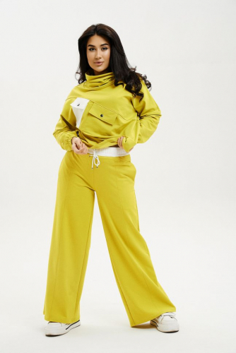Ткань: футер с лайкрой 2-х нитка; Состав: хлопок 72%, п/э 20%, эластан 8%; Сезонность: зима, весна, лето, осень; Стиль: повседневный; Застежка: без застежки; Карман: с карманами; Производство: г. Иваново, швейное производство НАТАЛИ; Тип изделия: брюки; Цвет: желтый