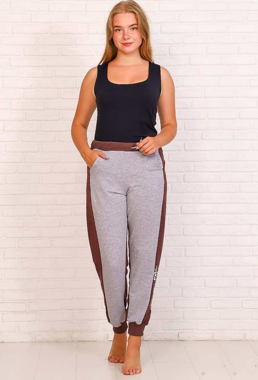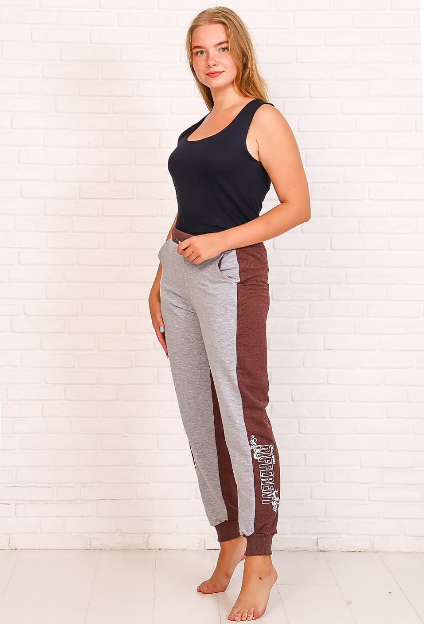 Оригинальные спортивные женские брюки с печатью на ноге, снизу на эластичных манжетах. Пояс на резинке регулируется завязками, боковые карманы.