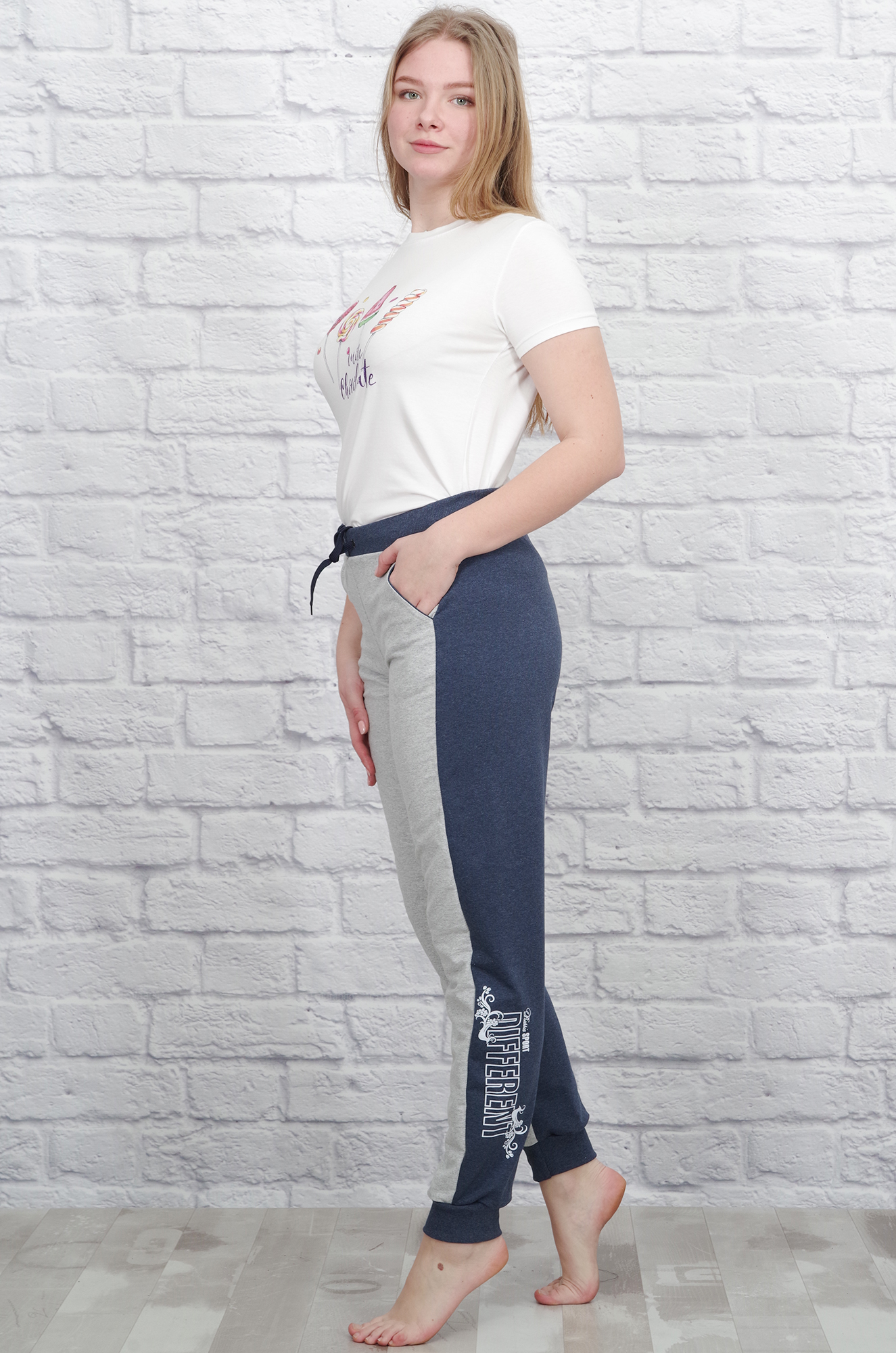 Оригинальные спортивные женские брюки с печатью на ноге, снизу на эластичных манжетах. Пояс на резинке регулируется завязками, удобные боковые карманы.