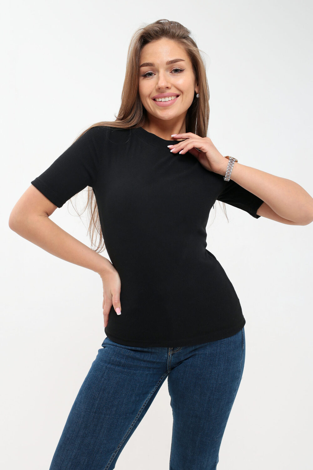 Стильная и мягкая футболка в рубчик! Цвет: черный; Материал: вискоза;вискоза; Состав: Вискоза 30%, пэ 65%, лайкра 5%.