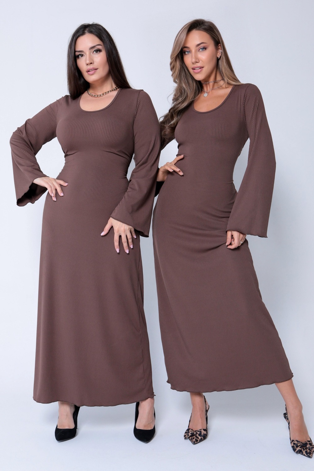 - Длинные расклешенные широкие рукава добавляют изысканности обтягивающему платью в рубчик и гармонично завершают композицию.