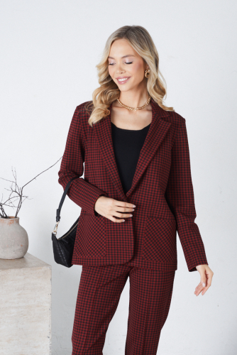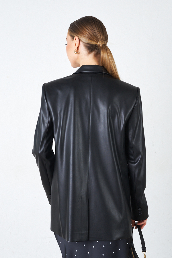 Жакет из эластичного полотна, с покрытием, имитирующим кожу. Изделие полуприлегающего силуэта с английским воротником и застежкой на пуговицы. На передней части жакета выполнены карманы в рамку с клапаном. По центру задней части выполнена шлица - элемент декоративный и необходимый. Обеспечивает свободу движения, добавляет шику и элегантности. Втачной длинный рукав, снизу имитация шлицы с пуговицами. Изделие идеально держит форму, имеет четкую линию плеча благодаря плечевым накладкам. Жакет на подкладке.