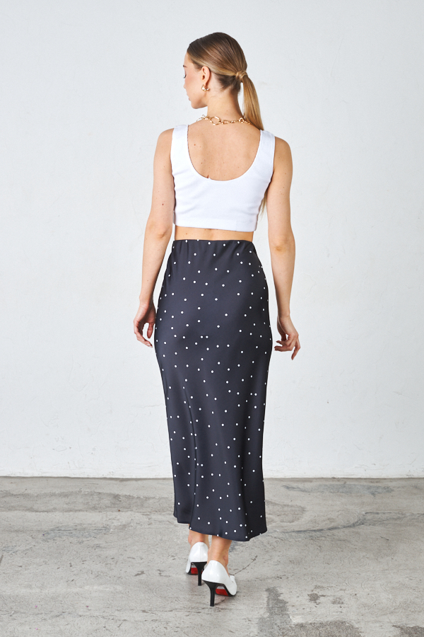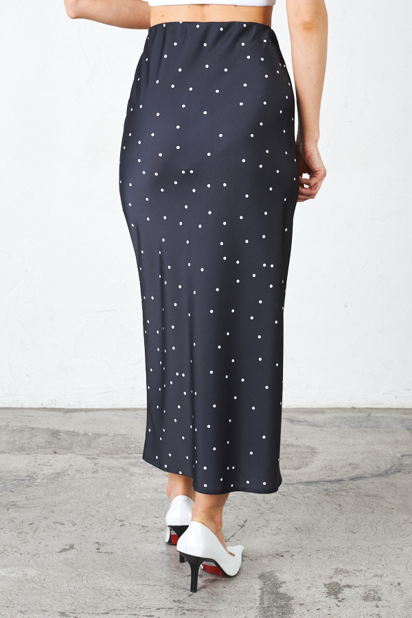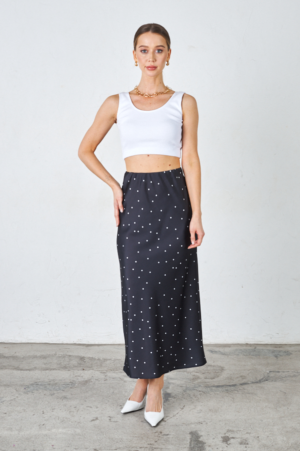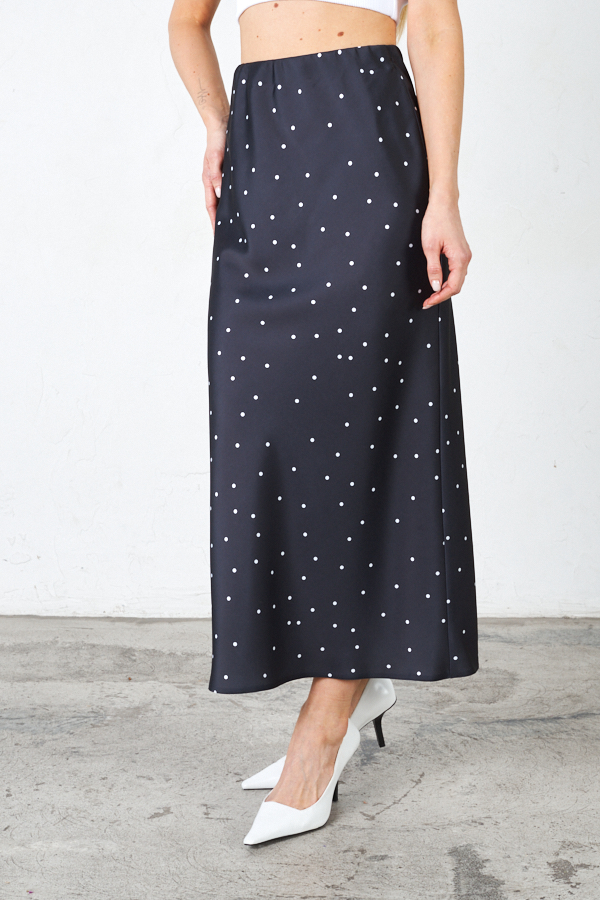 Юбка прямого силуэта из атласной ткани. Крой юбки по косой, на линии талии скрытая резинка.