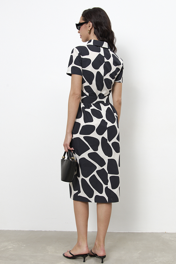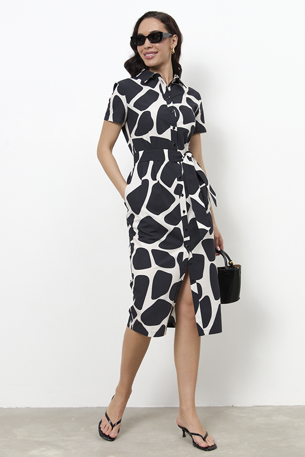 Платье приталенного силуэта из хлопковой плательной ткани. Изделие отрезное по линии талии с защипами. В боковых швах карманы. Втачной короткий рукав. Притачная планка с застёжкой на пуговицы. Вырез горловины обработан отложным воротником на стойке. В комплекте пояс из основной ткани.