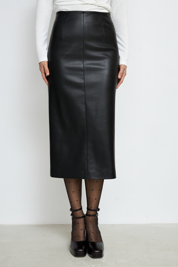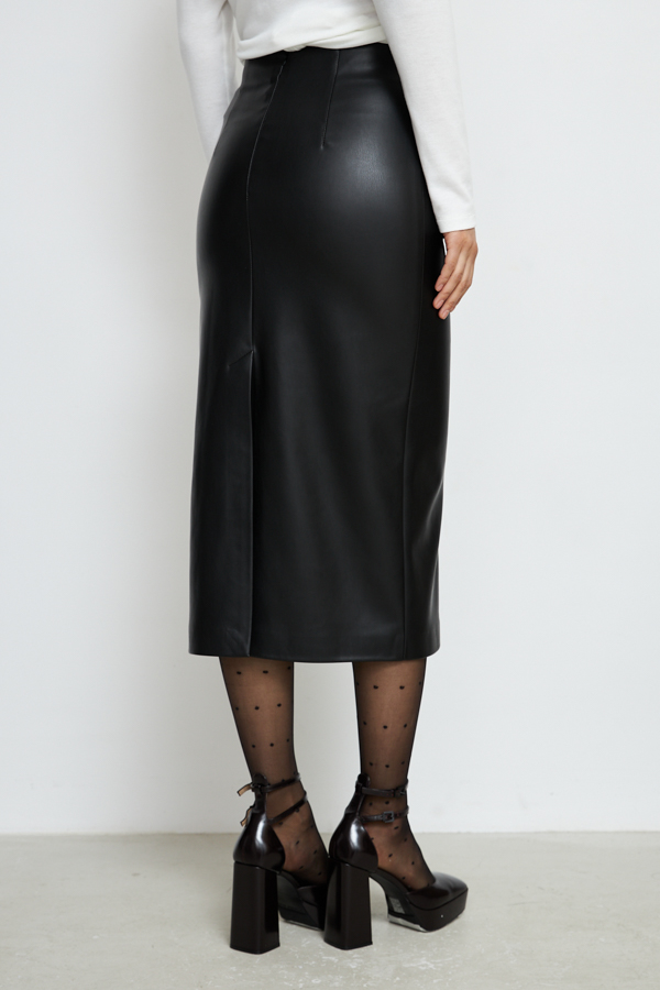 Юбка прилегающего силуэта из эластичного полотна, с покрытием, имитирующим кожу. По центру передней и задней части изделия выполнены швы, на передней части шов с декоративной строчкой. Сзади по среднему шву застёжка-молния, снизу шлица с разрезом. Изделие без пояса, верхний срез обработан обтачкой. На передней и задней половине юбки выполнены талиевые вытачки с декоративной строчкой.
