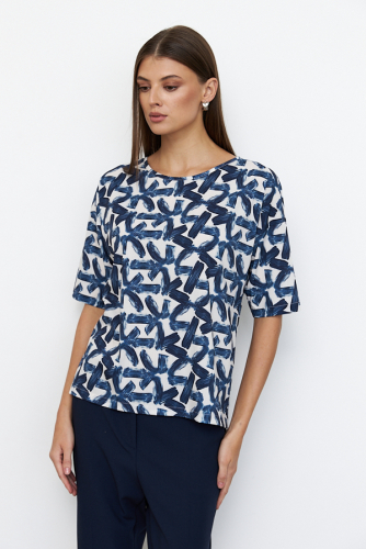 Блуза из вискозной ткани с сатиновым блеском. Свободный силуэт с разрезами в боковых швах и застёжкой на пуговицы. На задней части изделия выполнена кокетка с небольшой складкой. Вырез горловины обработан отложным воротником на стойке. Втачной рукав на манжете с застёжкой на пуговицы. Изделие украшено съемной планкой с перьями. Перед стиркой планку с перьями необходимо снять.