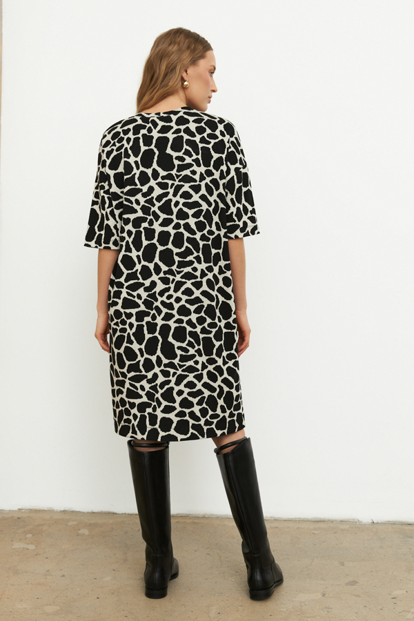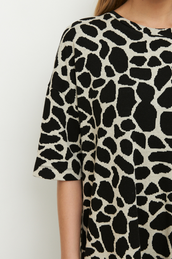 Платье свободного силуэта выполнено из эластичного полотна с жаккардовым узором. Изделие со спущенной линией плеча и рукавом до локтя. Вырез горловины оформлен бейкой из основной ткани. В таблице размеров представлены параметры человека, а не изделия.