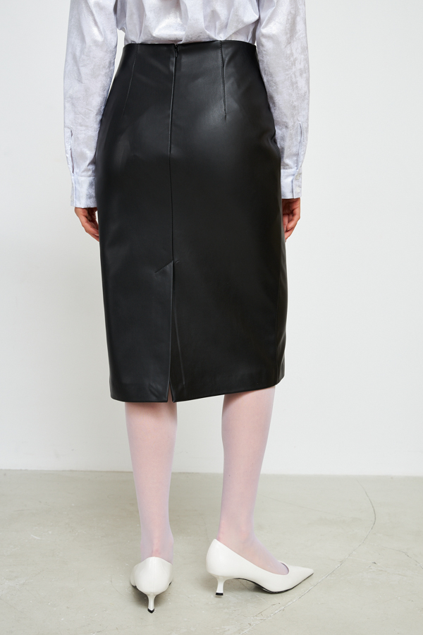 Юбка прилегающего силуэта из эластичного полотна, с покрытием, имитирующим кожу. По центру передней и задней части изделия выполнены швы, на передней части шов с декоративной строчкой. Сзади по среднему шву застёжка-молния, снизу шлица с разрезом. Изделие без пояса, верхний срез обработан обтачкой. На передней и задней половине юбки выполнены талиевые вытачки с декоративной строчкой.