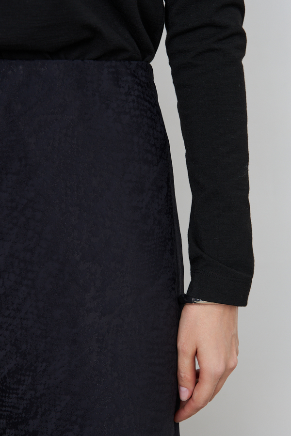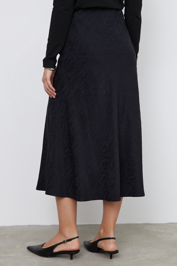Юбка, слегка расширенная книзу из вискозной ткани с вытканным жаккардовым узором "рептилия". Крой юбки по косой, на линии талии скрытая резинка.