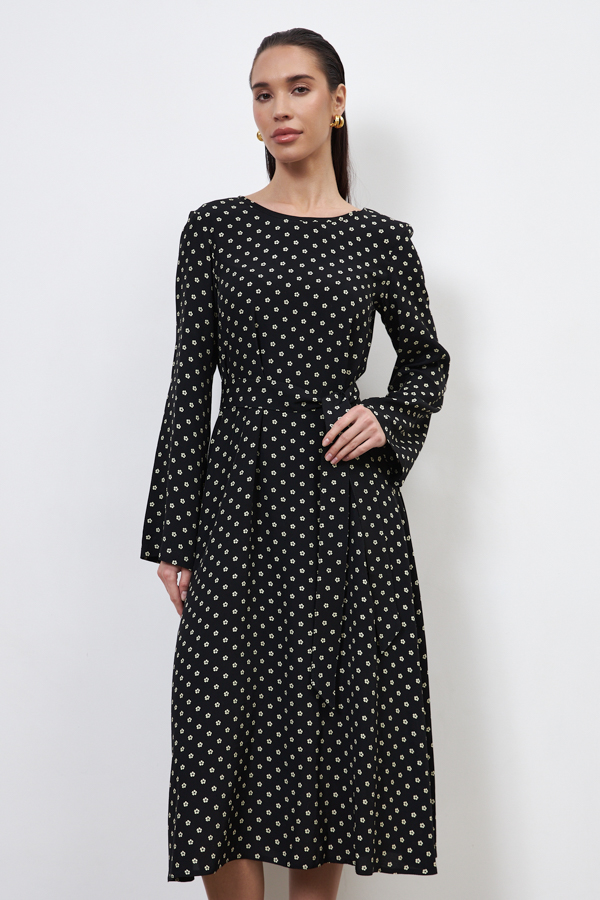 Платье из вискозной ткани свободного силуэта, расширенное книзу. Втачной широкий рукав. Круглый вырез горловины оформлен косой бейкой, сзади застёжка на петлю-пуговицу. В комплекте пояс из основной ткани. В таблице размеров представлены параметры человека, а не изделия.