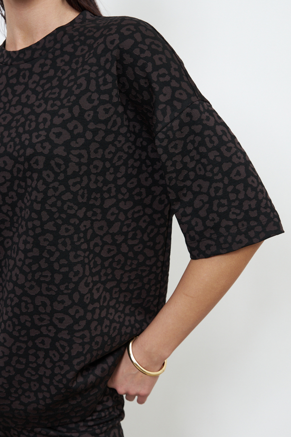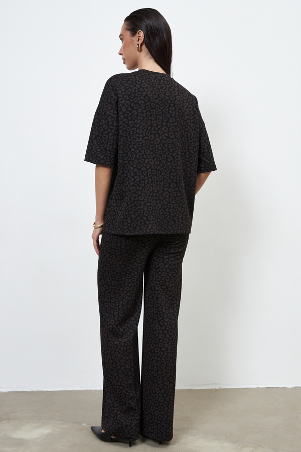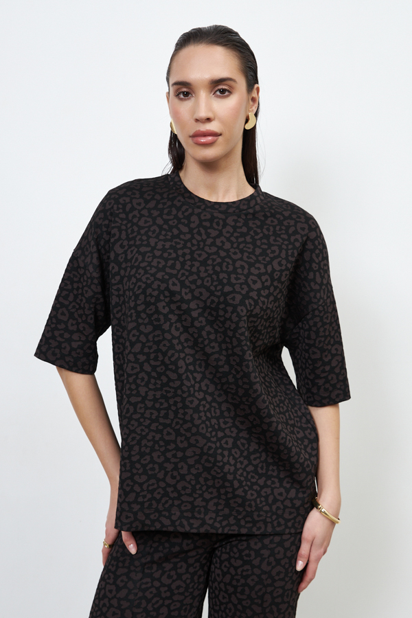 Костюм из эластичного полотна. Джемпер свободного силуэта со спущенной линией плеча и рукавом до локтя. Вырез горловины оформлен бейкой из основной ткани. Брюки прямого силуэта. Пояс притачной с эластичной резиной. На передней части брюк застрочены стрелки.