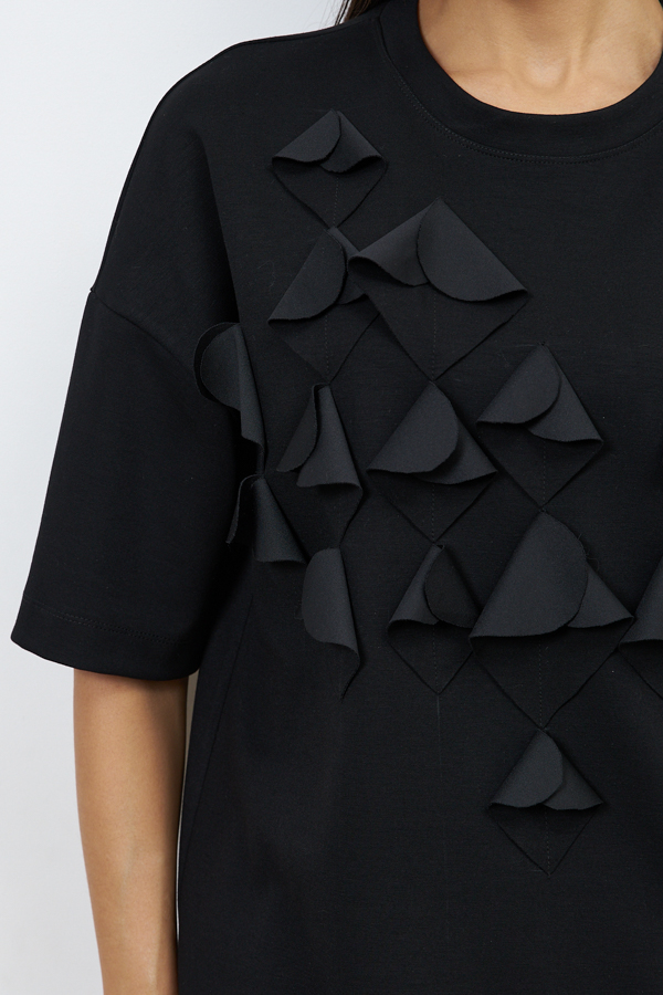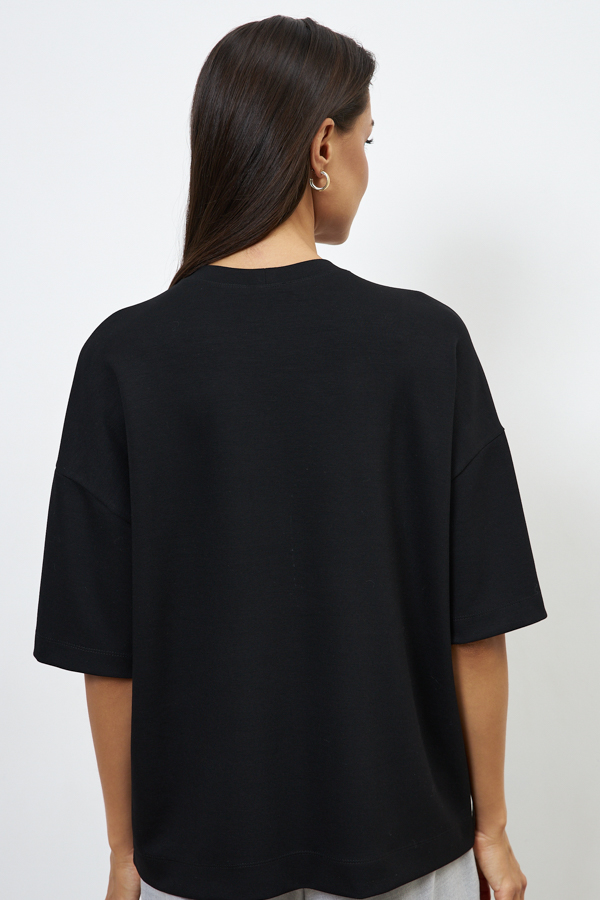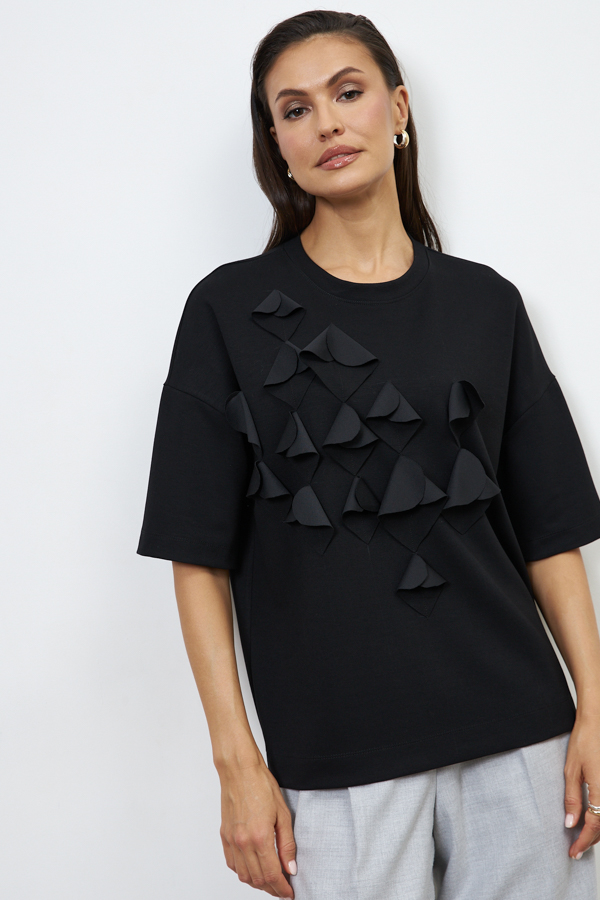 Джемпер свободного силуэта со спущенной линией плеча и рукавом до локтя выполнен из эластичного полотна. Вырез горловины оформлен бейкой из основной ткани. На передней части изделия выполнена аппликация. В таблице размеров представлены параметры человека, а не изделия.