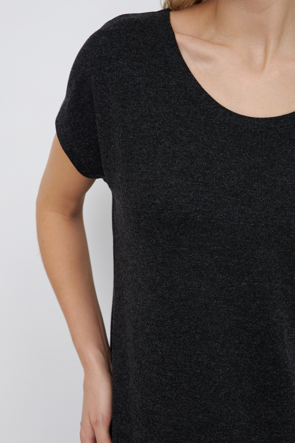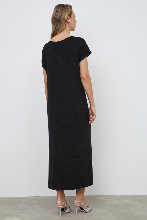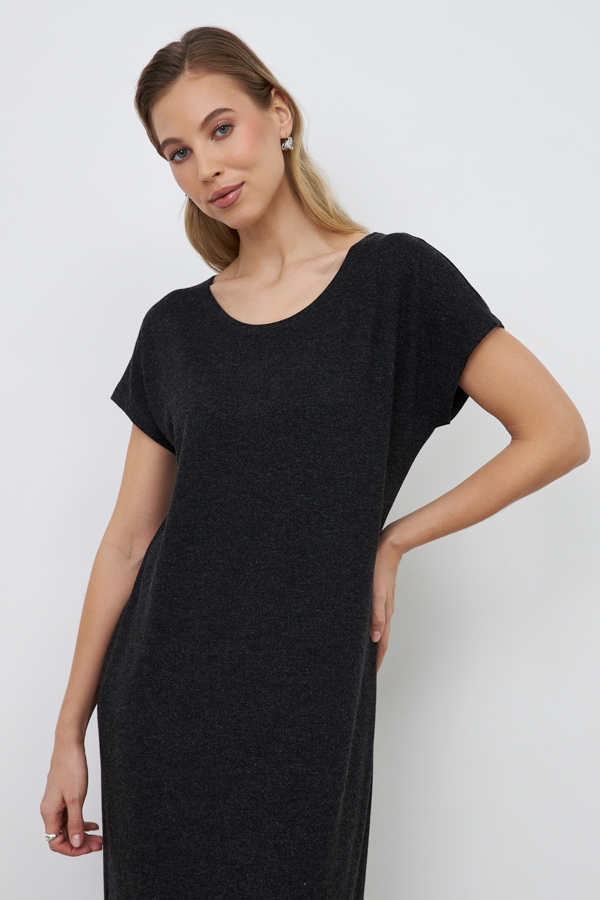 Платье из меланжевого эластичного полотна. Полуприлегающий силуэт, с разрезом в боковом шве. Цельнокроеный короткий рукав. Круглый вырез горловины.