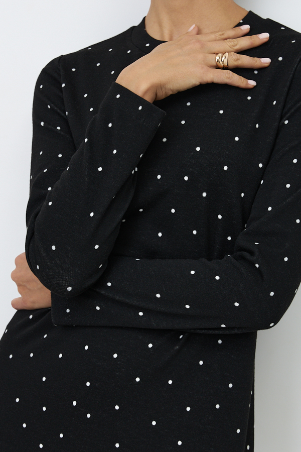Платье полуприлегающего силуэта из эластичного полотна. Круглый вырез горловины оформлен притачной бейкой. Втачной длинный рукав.