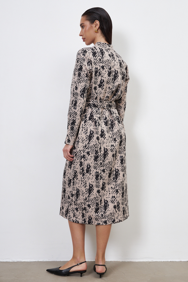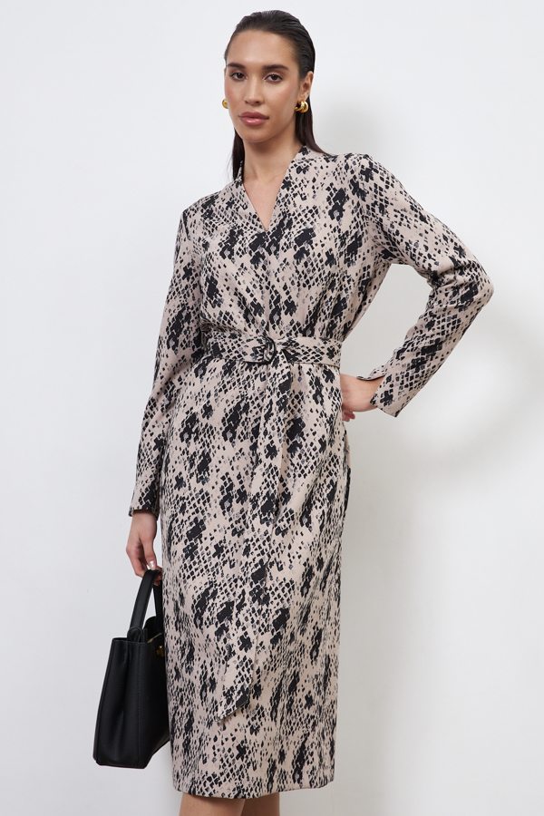 Платье свободного силуэта из плательной ткани. По центру передней части изделия выполнен шов. Цельнокроеная стойка, переходящая в V-образный вырез горловины, визуально делает фигуру стройнее. Втачной длинный рукав с центральным швом и декоративным разрезом по низу рукава. В комплекте пояс из основной ткани.