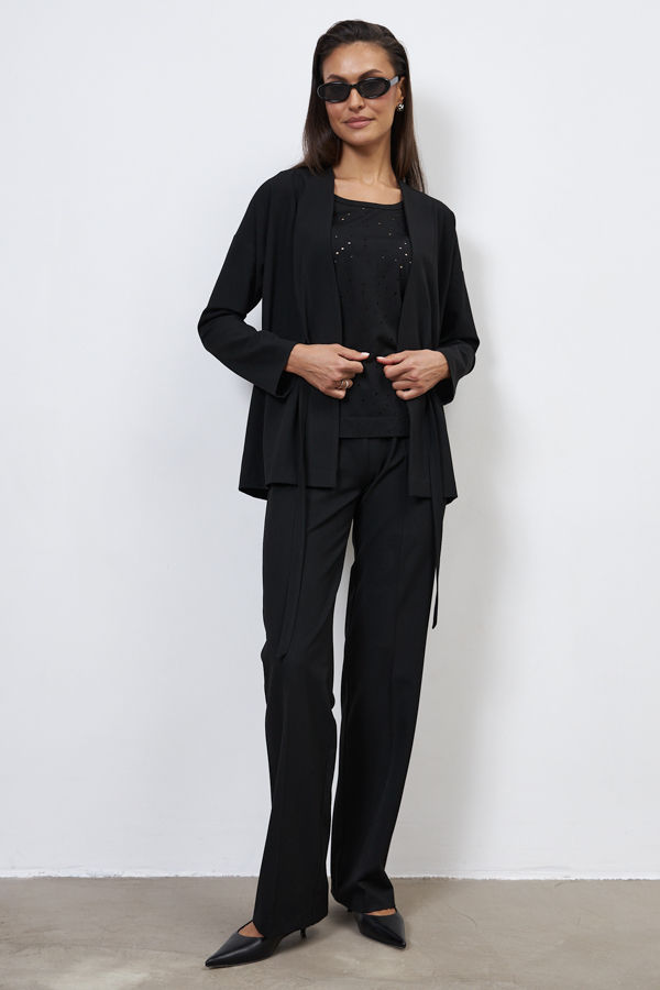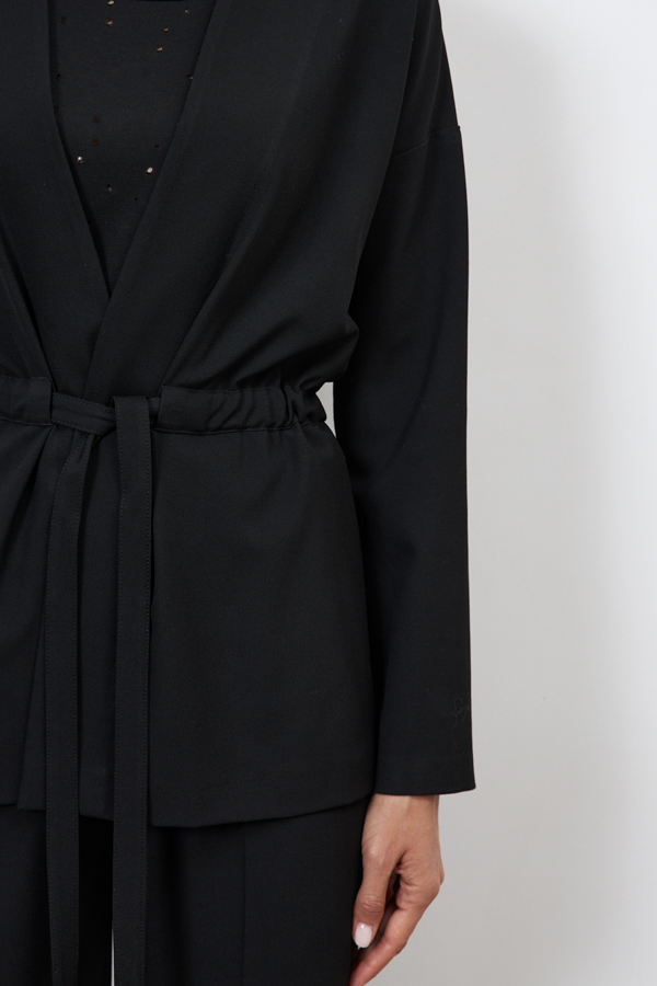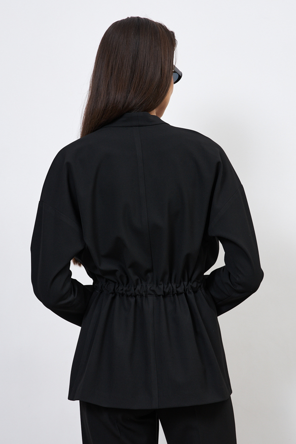 Жакет из костюмной ткани свободного силуэта. По линии талии изделие затягивается на кулиску. Цельнокроеная стойка, переходящая в борт, визуально делает фигуру стройнее. Втачной длинный рукав в спущенную пройму.