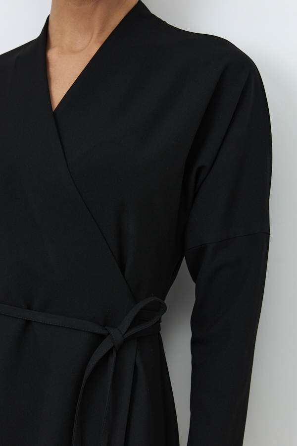 Платье прямого силуэта из плательной ткани. Глубокий V-образный вырез горловины плавно переходит в запах, фиксируется притачным поясом. Втачной длинный рукав в спущенную пройму.