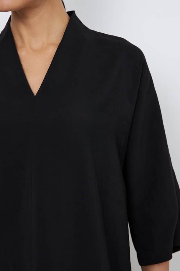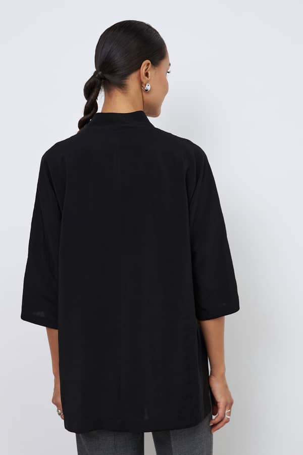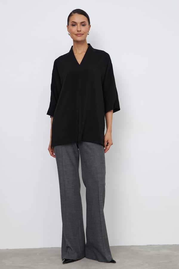 Блуза из вискозной ткани свободного силуэта с разрезами в боковых швах. По центру передней части изделия выполнен шов. Цельнокроеная стойка, переходящая в V-образный вырез горловины, визуально делает фигуру стройнее. Цельнокроеный рукав 3/4.