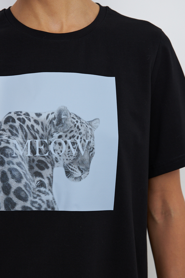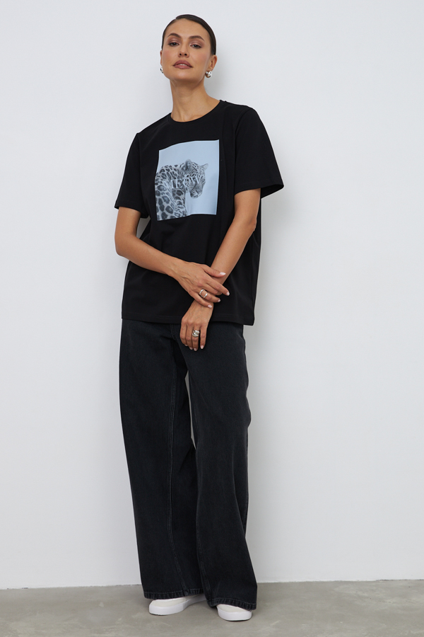 Джемпер из хлопкового эластичного полотна свободного силуэта. Втачной короткий рукав. Круглый вырез горловины оформлен бейкой.