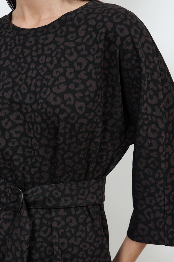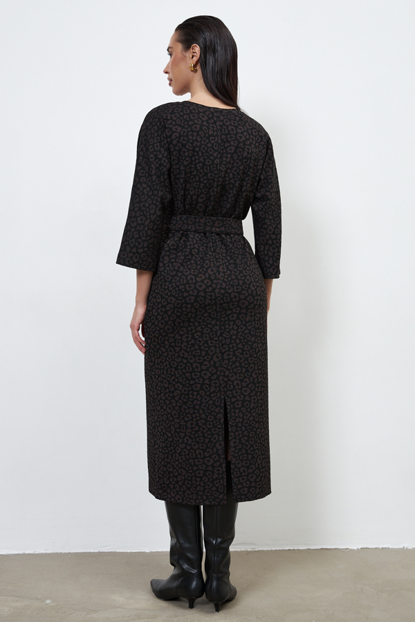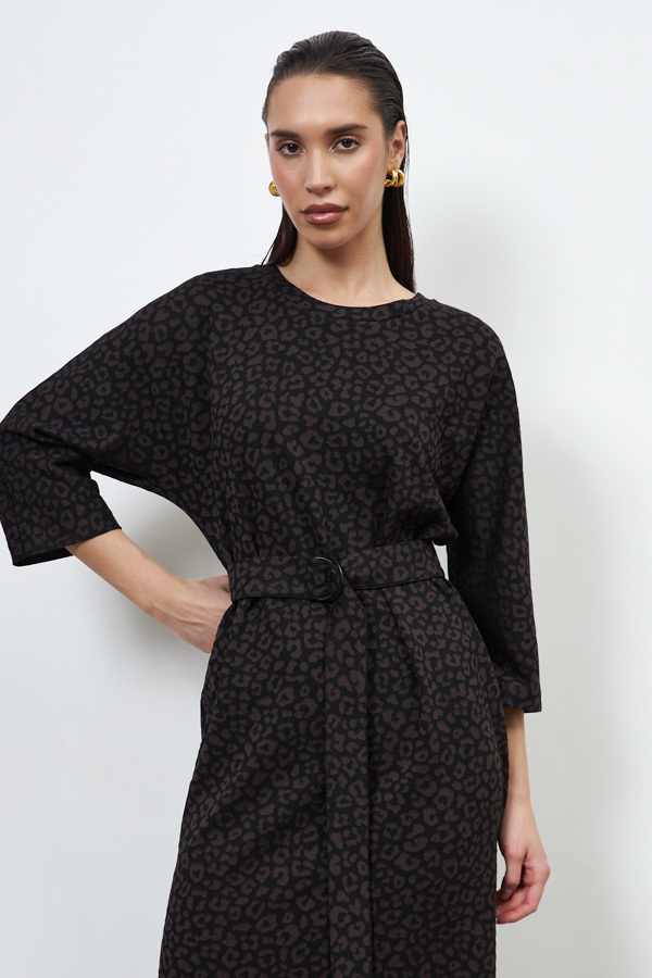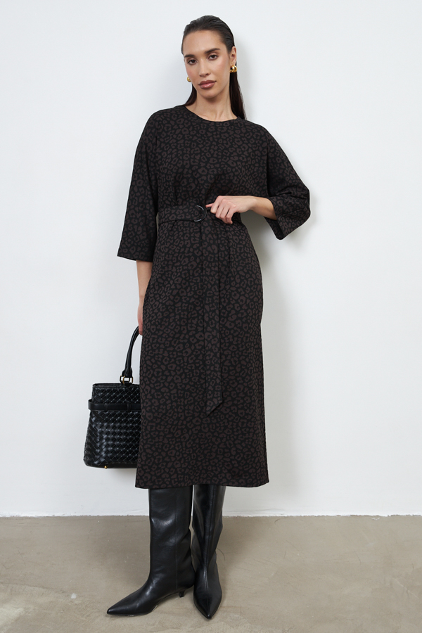 Платье из эластичного полотна полуприлегающего силуэта. Спинка со средним швом, снизу разрез. Цельнокроеный рукав в стиле кимоно. Круглый вырез горловины оформлен бейкой. В комплекте пояс из основной ткани. В таблице размеров представлены параметры человека, а не изделия.