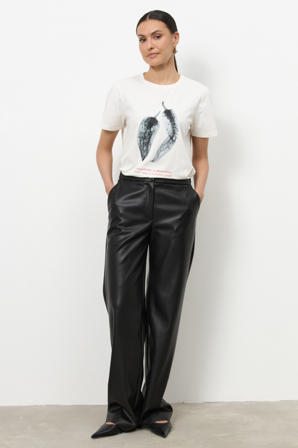 Брюки из эластичного полотна, с покрытием, имитирующим кожу. Прямой силуэт. На передней части брюк карманы с подкройным бочком. Притачной пояс, застёжка на металлическую молнию-гульфик и кнопку.
