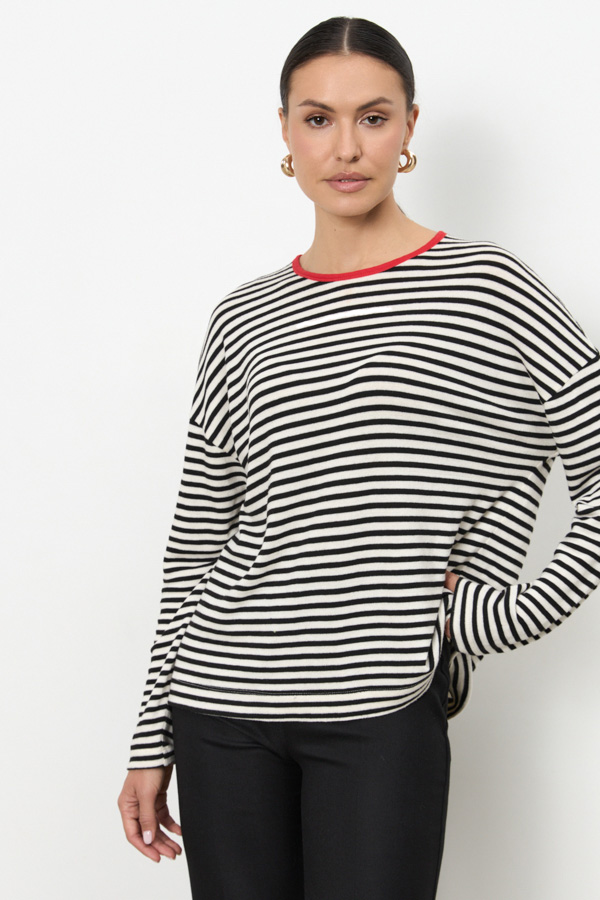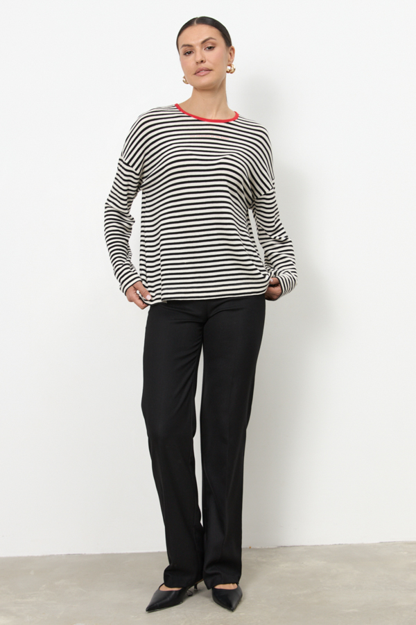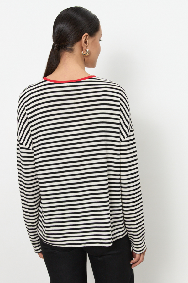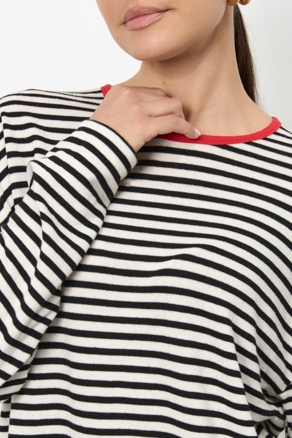 Джемпер из эластичного полотна. Свободный силуэт со спущенной линией плеча и длинным рукавом. Вырез горловины окантован эластичной бейкой. В таблице размеров представлены параметры человека, а не изделия.
