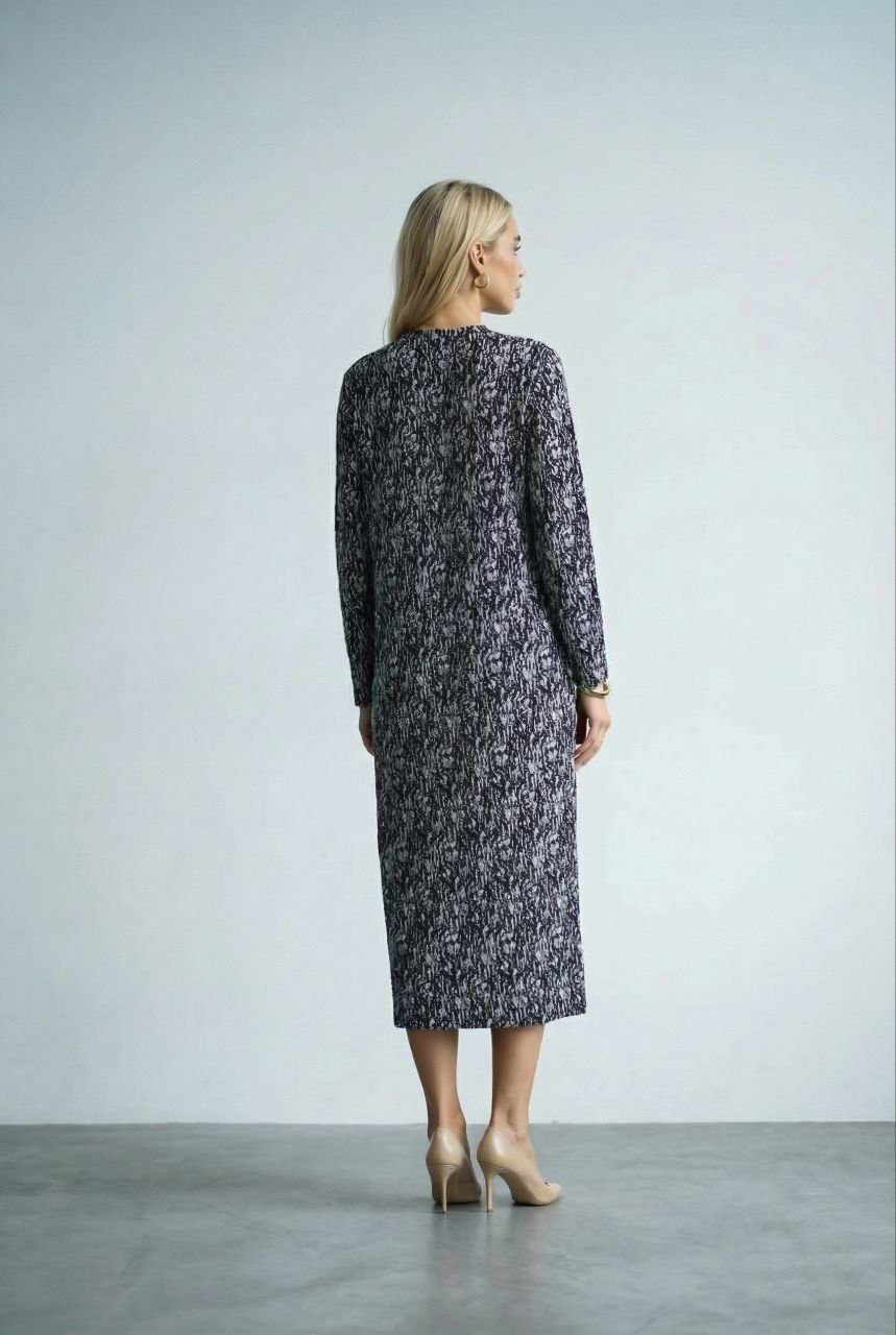 Платье полуприлегающего силуэта из эластичного полотна. Круглый вырез горловины оформлен притачной бейкой. Втачной длинный рукав.