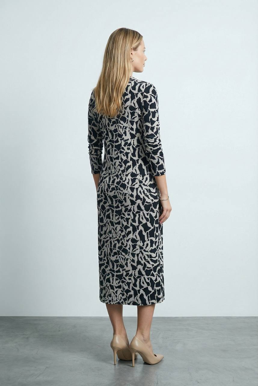 Платье полуприлегающего силуэта из эластичного полотна. Круглый вырез горловины оформлен притачной бейкой. Втачной длинный рукав.