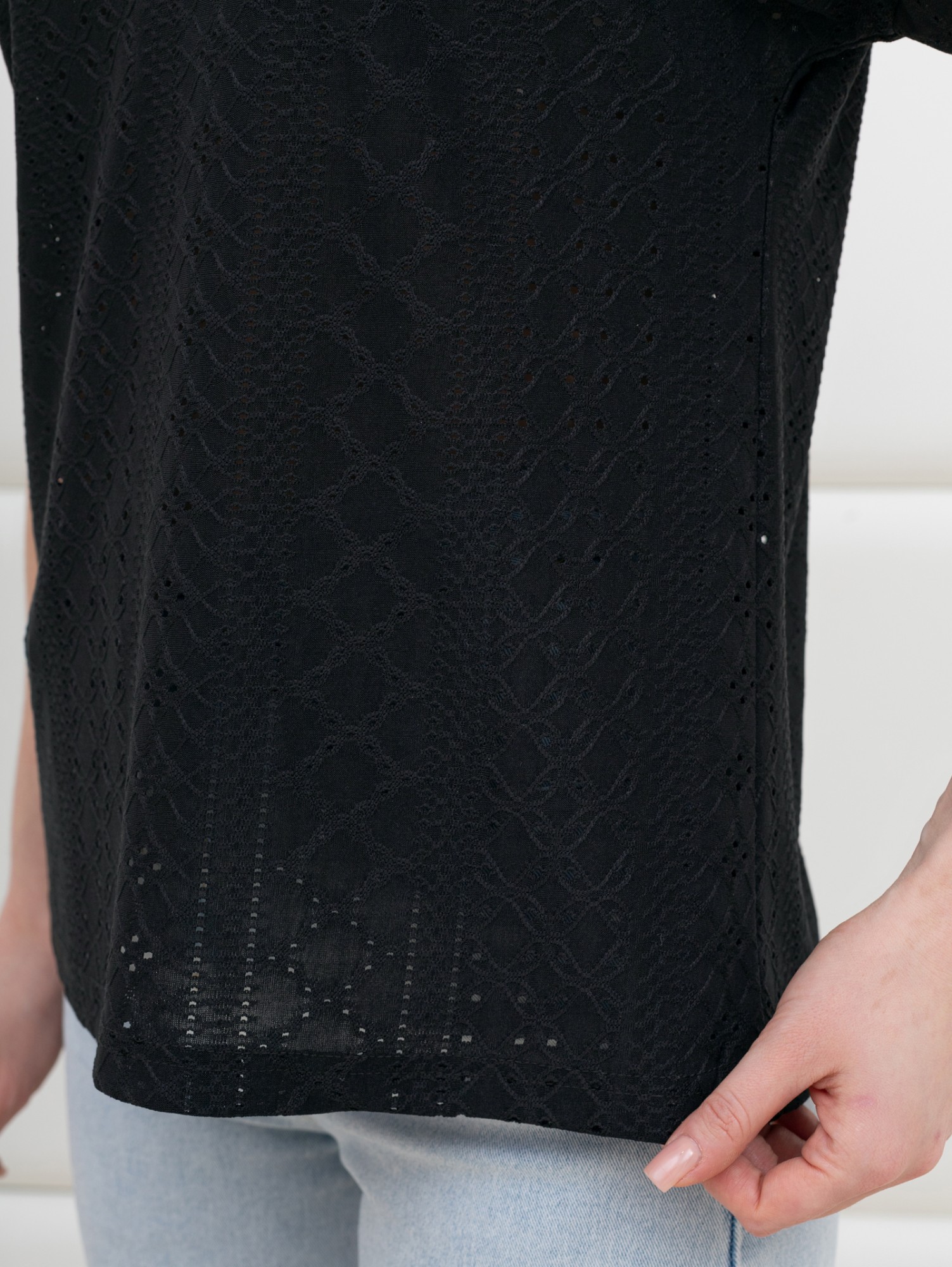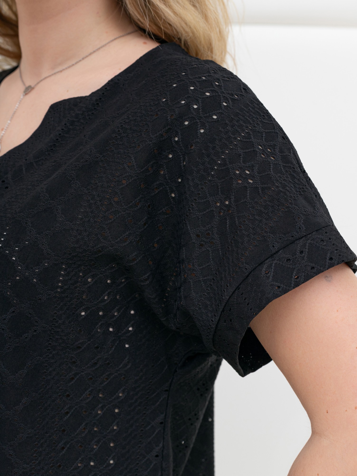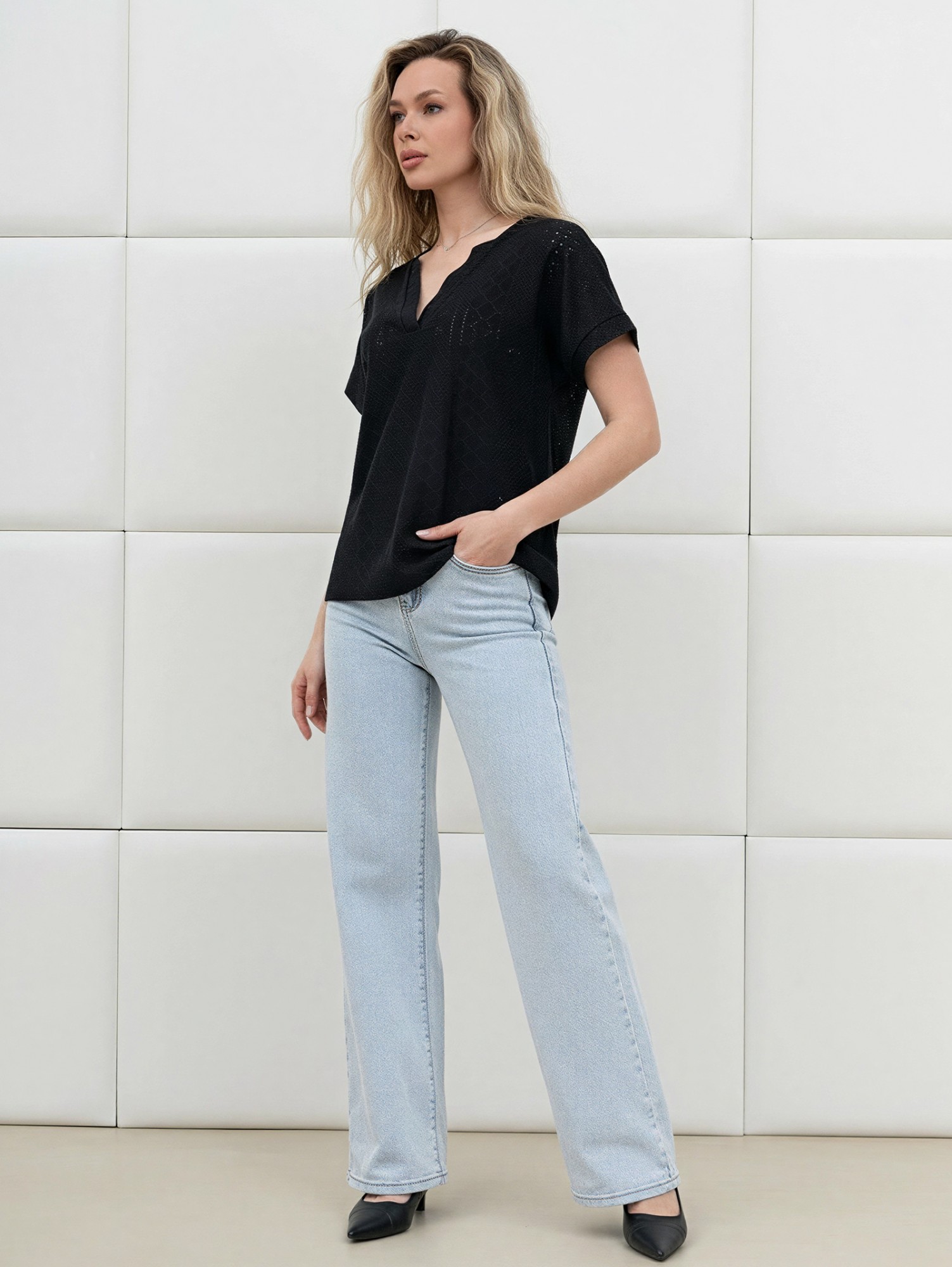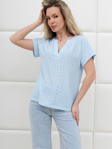 Блуза женская из гладкокрашенного трикотажного полотна «шитье», полуприталенного силуэта, с глубоким V-образным вырезом горловины, обработанным косыми планками, короткими цельнокроеными рукавами. Нижние срезы рукавов с притачными манжетами.