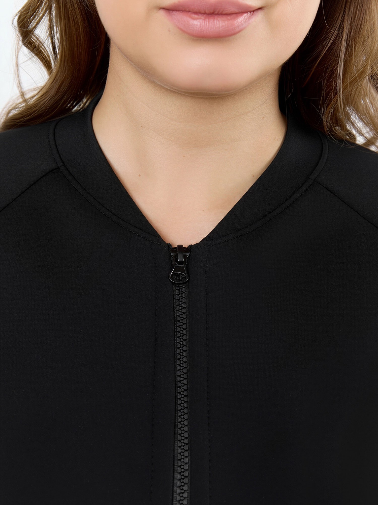 Куртка – бомбер женская из трикотажного гладкокрашенного полотна «скуба» свободная, с горловиной овальной формы обработанной втачной планкой, длинными рукавами кроя «реглан», обработанными подгибкой с эластичной тесьмой внутри, центральной бортовой застежкой на тесьму «молния». На полочке в рельефных швах выполнены карманы. Низ изделия обработан подгибкой с широкой эластичной тесьмой внутри.