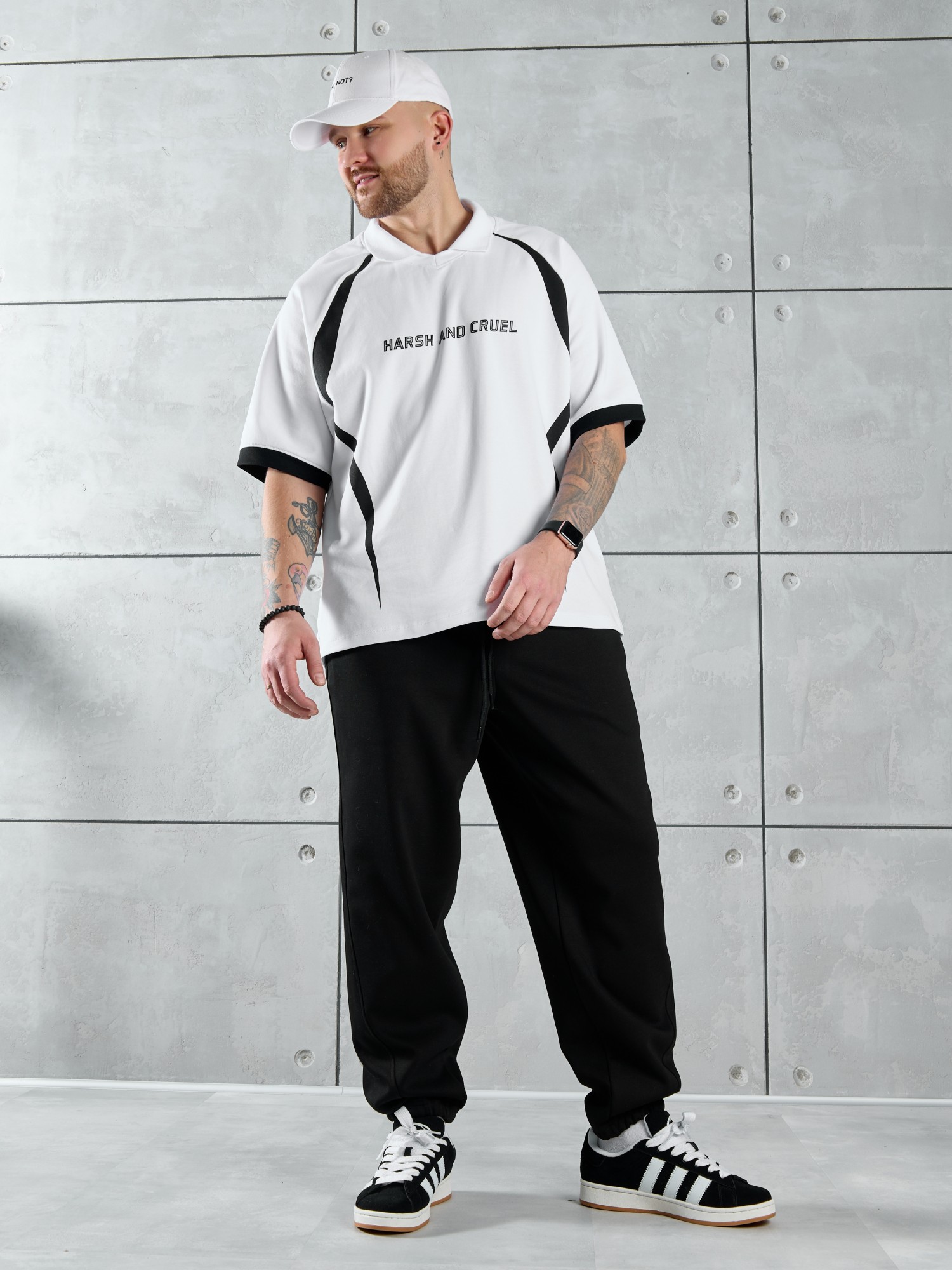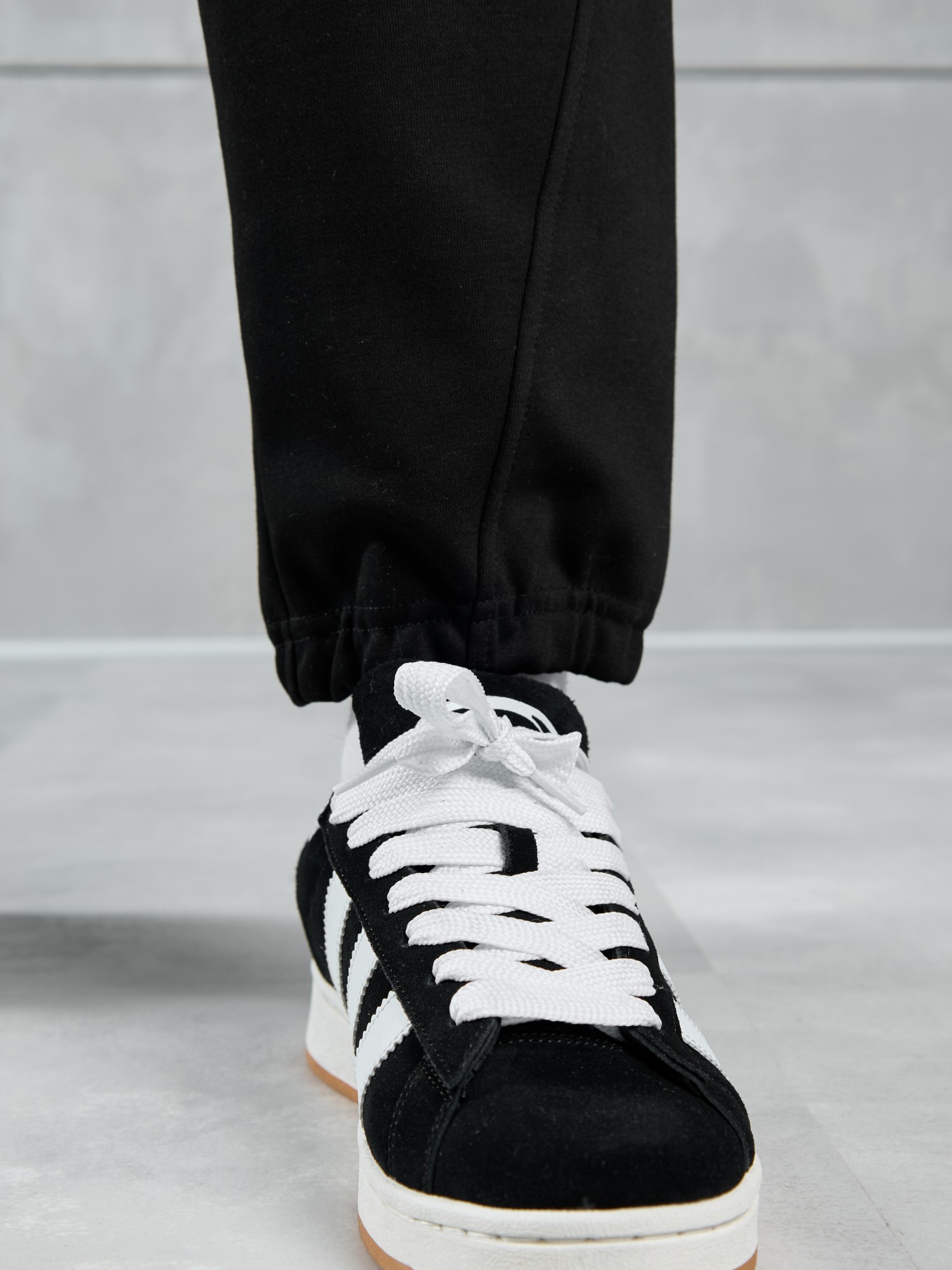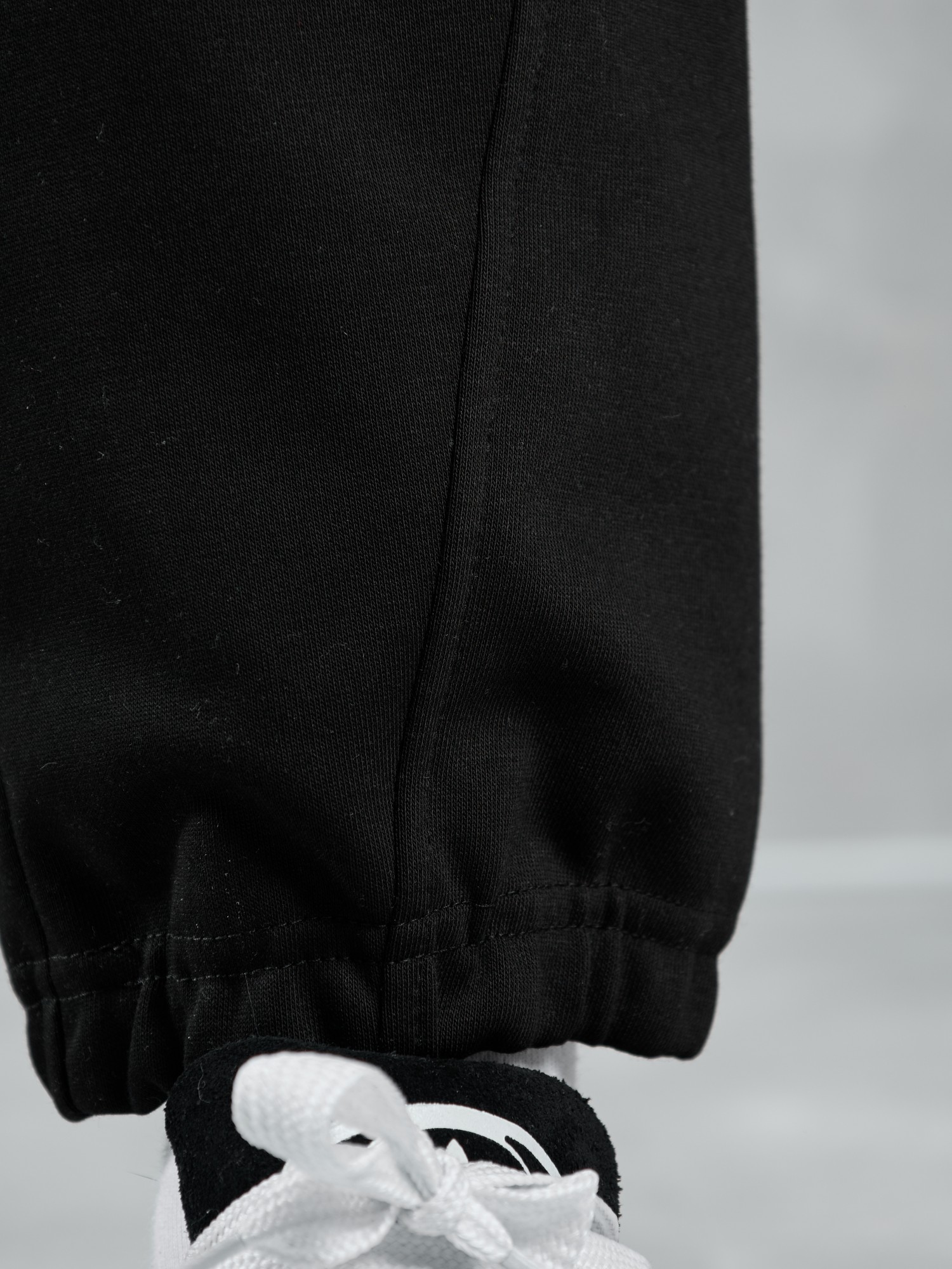 Брюки мужские из трикотажного полотна "лининг" свободного покроя, со смещенными к центрам передних половин боковыми швами, карманами в боковых швах и притачным поясом с эластичной тесьмой внутри. Нижние срезы обработаны подгибкой с эластичной тесьмой. Для регулирования степени прилегания изделия по талии предусмотрен шнурок, вставленный через две обметанные петли в центре пояса спереди.