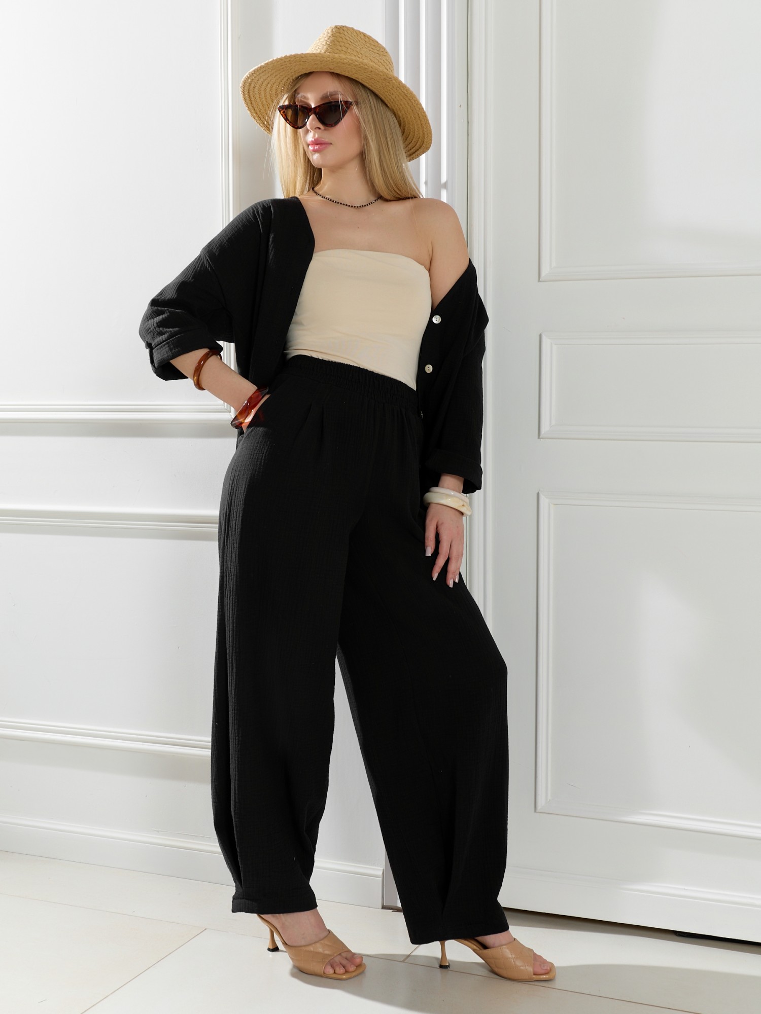 Брюки женские из фактурного гладкокрашеного полотна длинные, свободного покроя, на притачном поясе с эластичной тесьмой внутри, с карманами в боковых швах. По верхнему краю передних половин обработаны по две складки с собеих сторн. По низу брюк - также по 1 складке в боковых и шаговых швах.