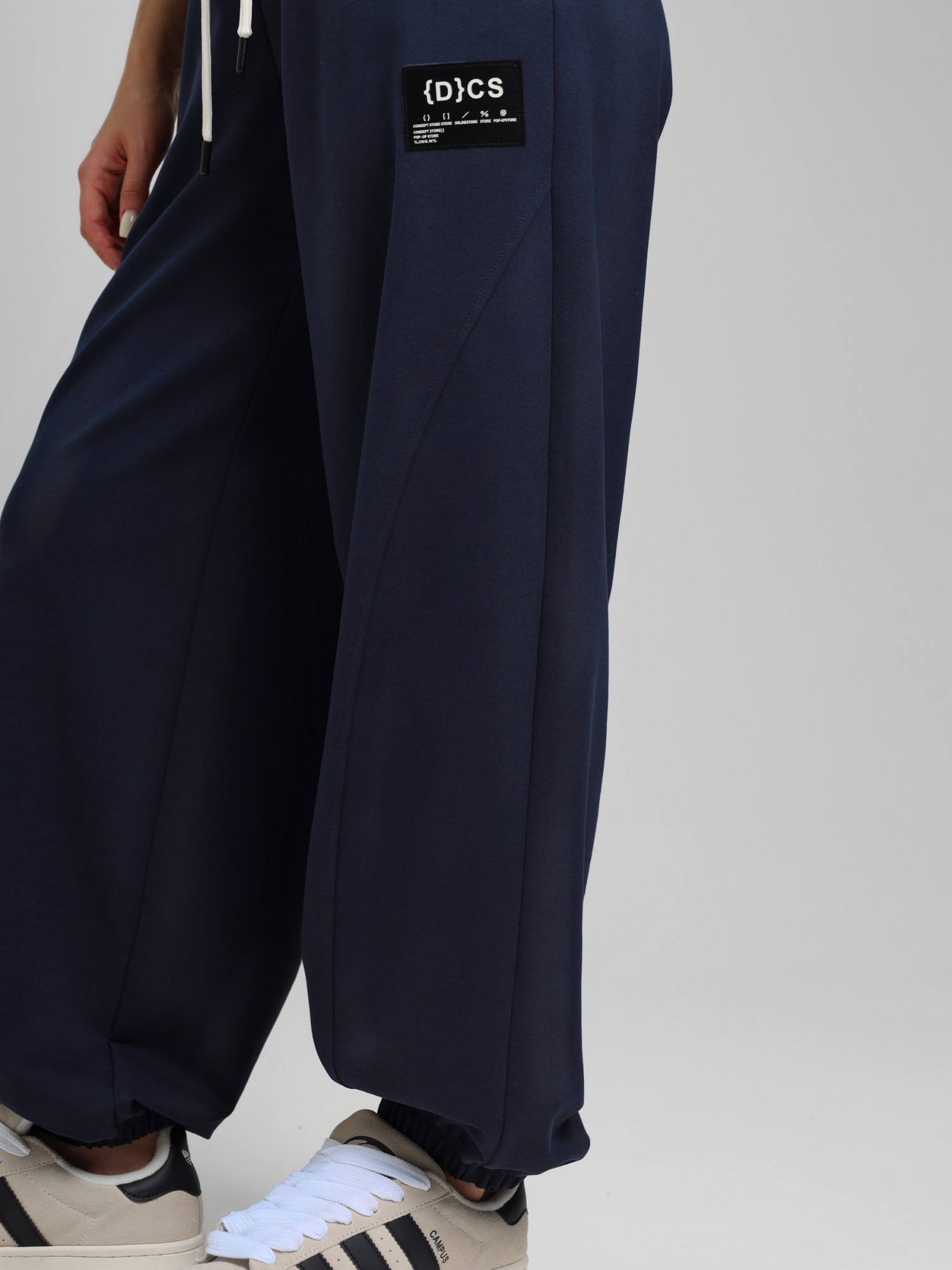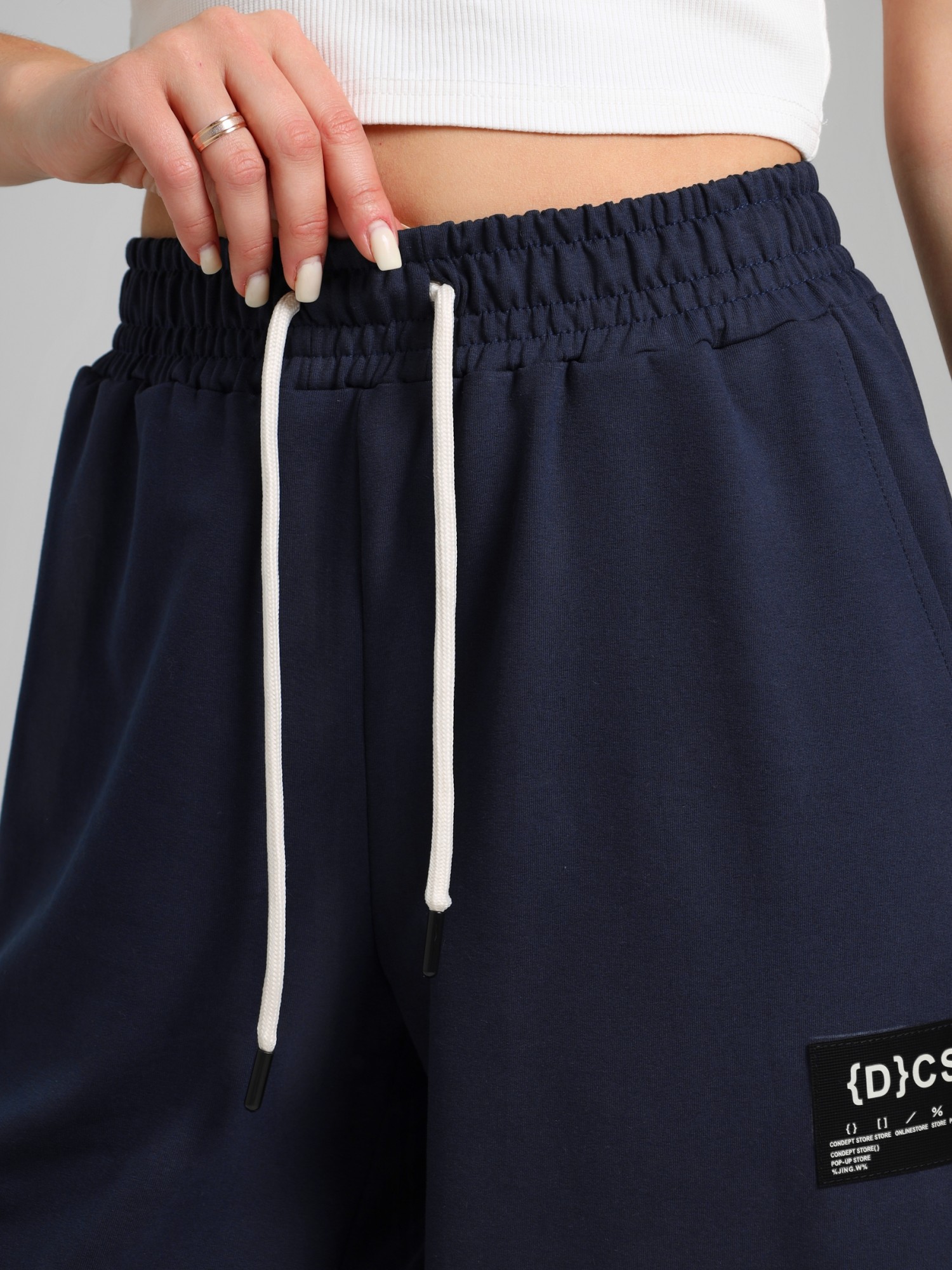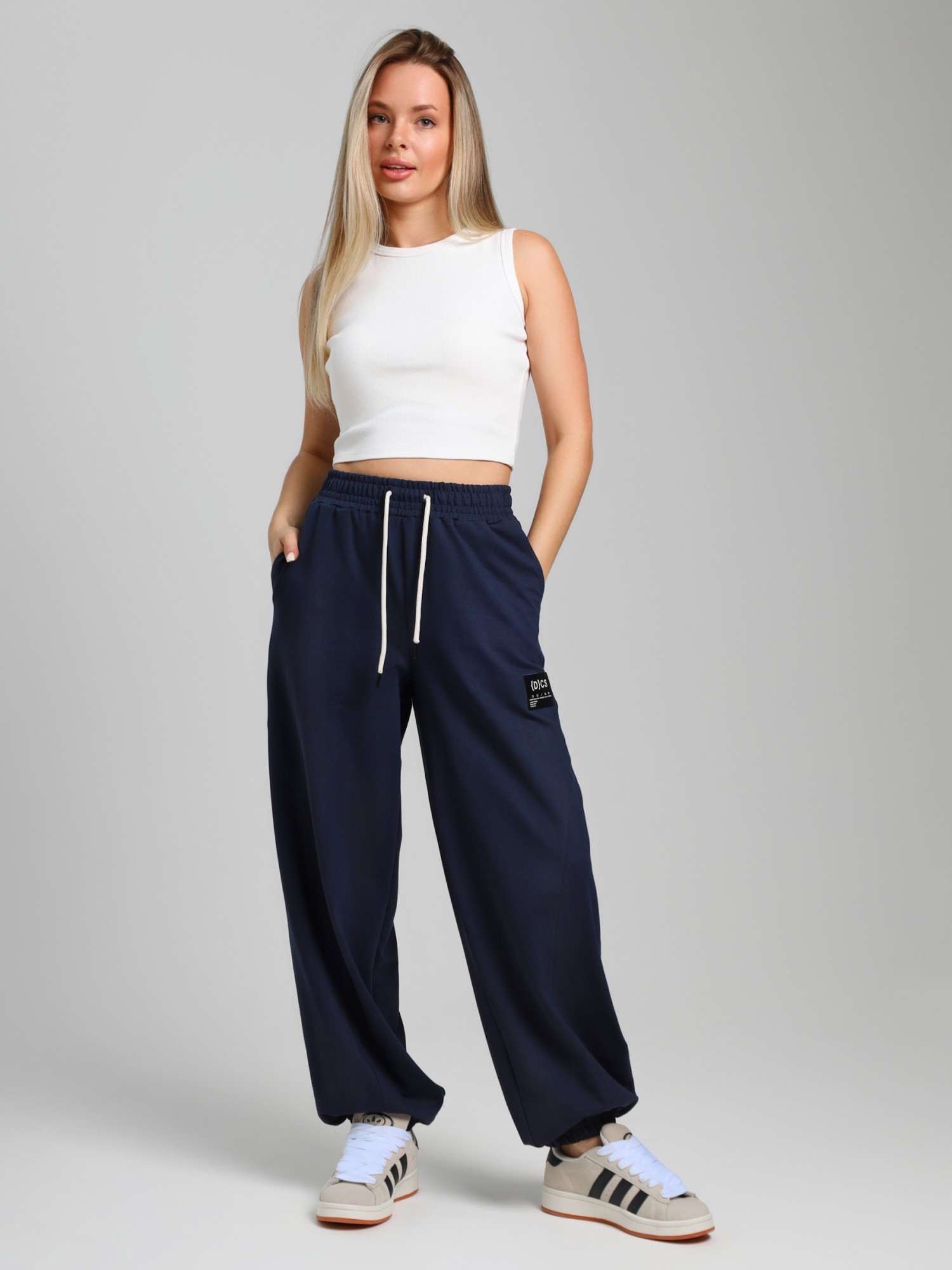 Брюки женские из трикотажного полотна "футер-двунитка", на притачном поясе с эластичной тесьмой внутри, с карманами в боковых швах и отделочными деталями фигурной формы на передних половинах. Нижние срезы брюк обработаны с эластичной тесьмой. По швам притачивания отделочных деталей, декоративных вставок и карманам настрочены отделочные строчки. На левой передней половине брюк ниже кармана настрочен декоративный элемент прямоугольной формы. Через две петли в центре пояса петли продет шнурок, позволяющий регулировать степень прилегания изделия по талии.
