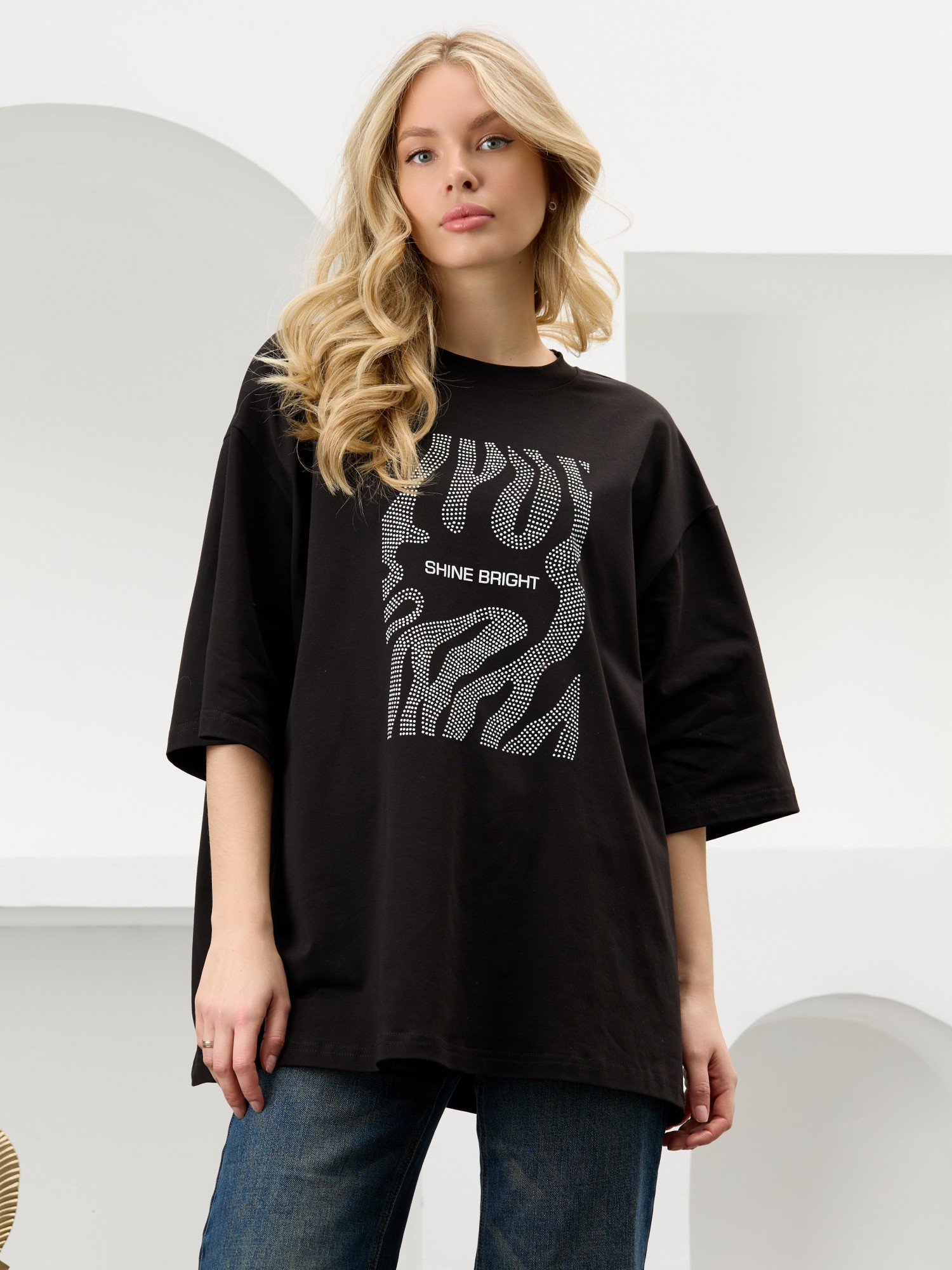 Футболка молодежная из гладкокрашенного трикотажного полотна «кулирка» с лайкрой, свободная покроя «оверсайз», с горловиной овальной формы, обработанной притачной планкой, рукавами длиной до локтя. На полочке выполнена печать в технике «шелкографии».