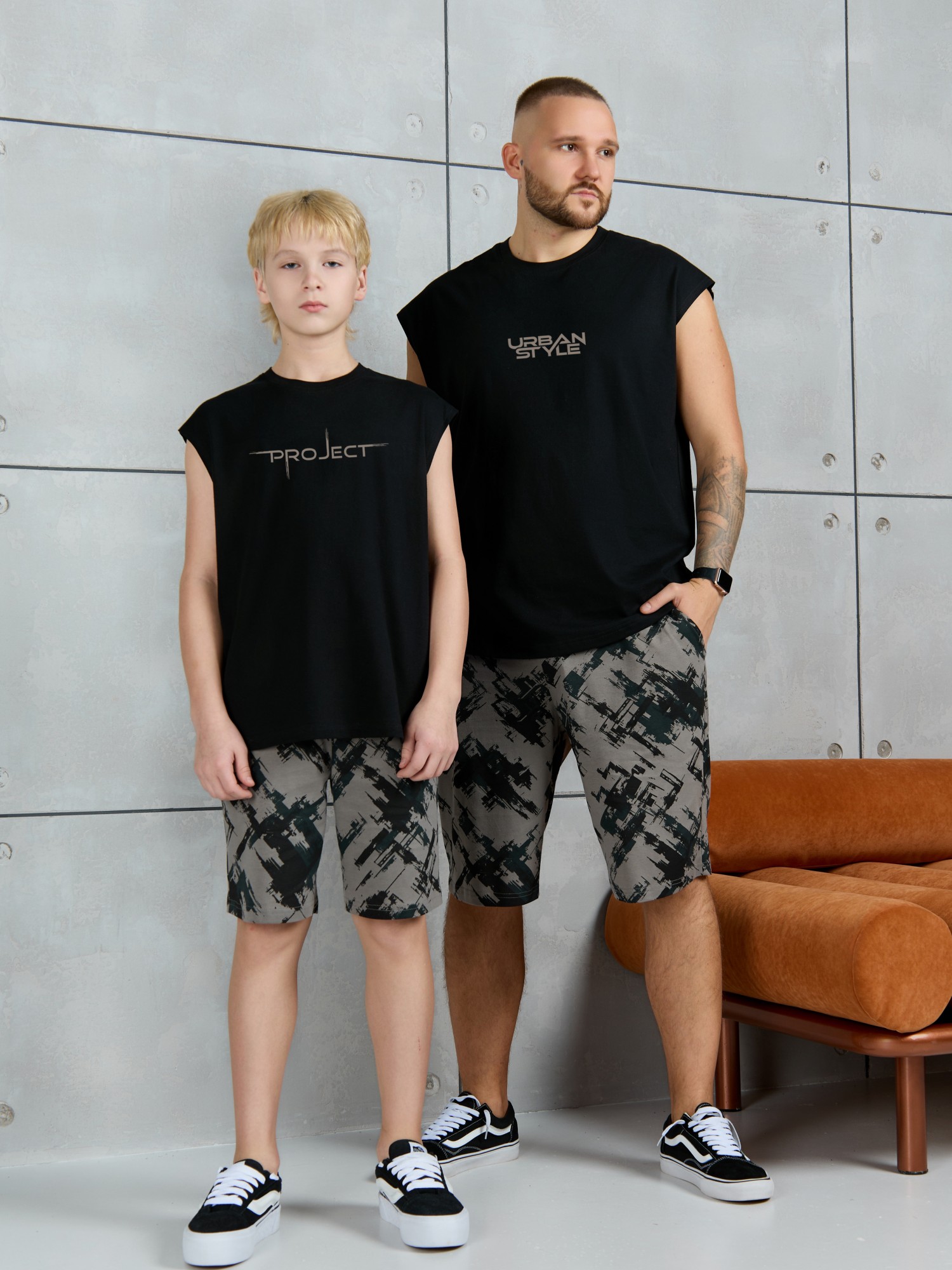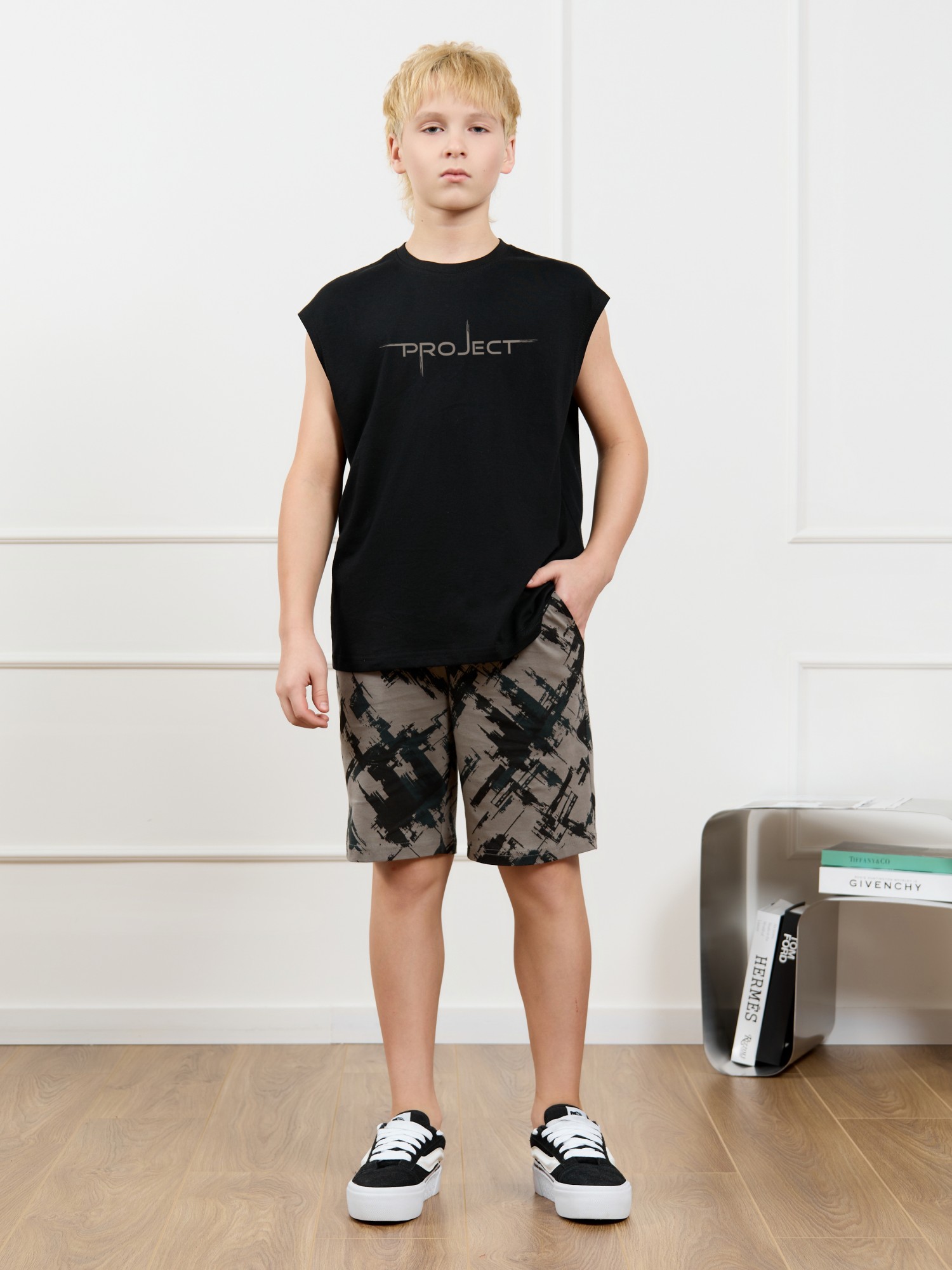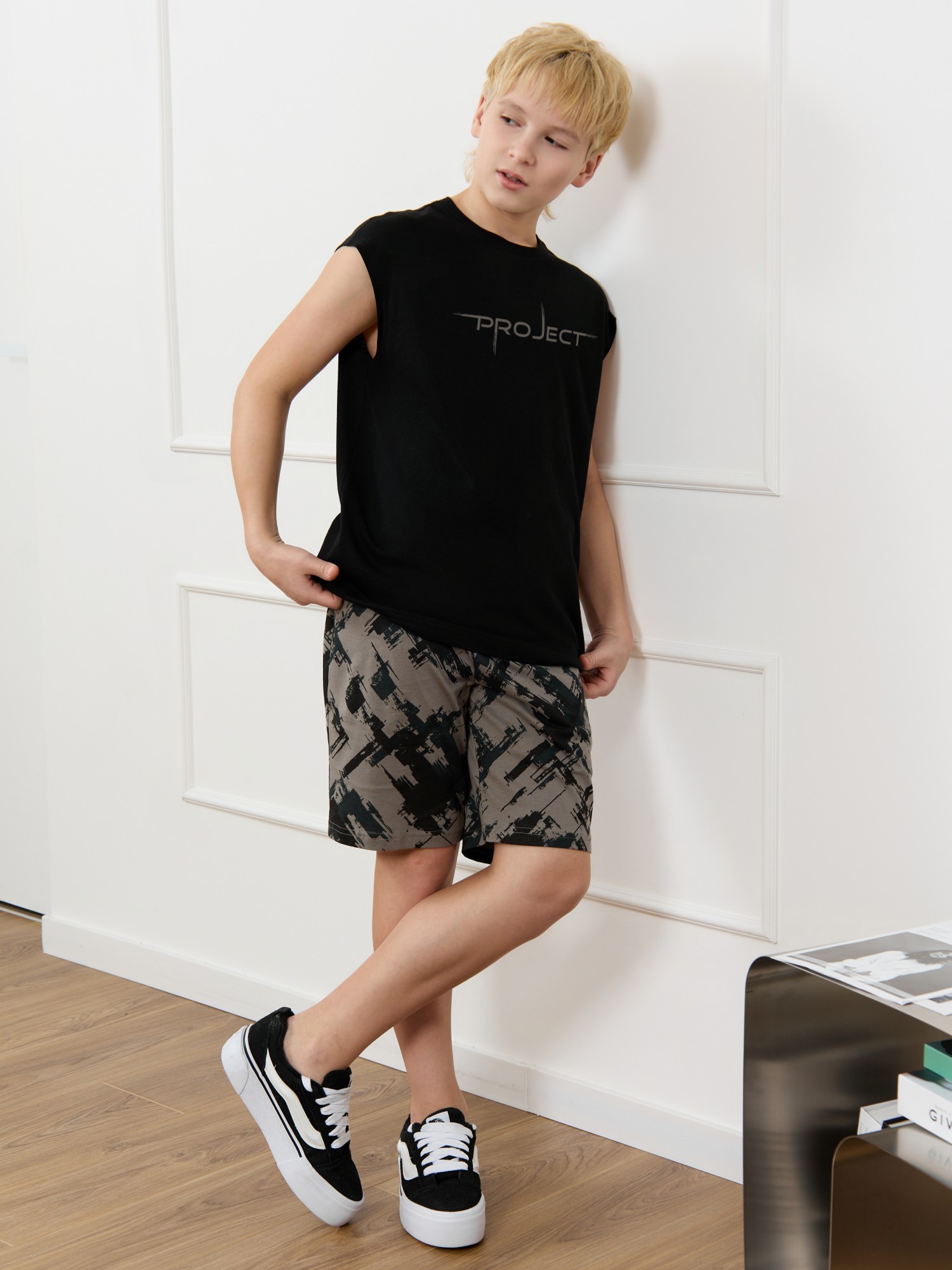 Костюм для мальчика, состоящий из майки и шорт. Майка однотонная с принтом на груди; модель свободная, со спущенной линией плеч и углубленной проймой. Шорты из полотна с набивным рисунком эксклюзивного дизайна, с боковыми карманами с обтачными входами, на притачном поясе с отстроченной эластичной тесьмой.