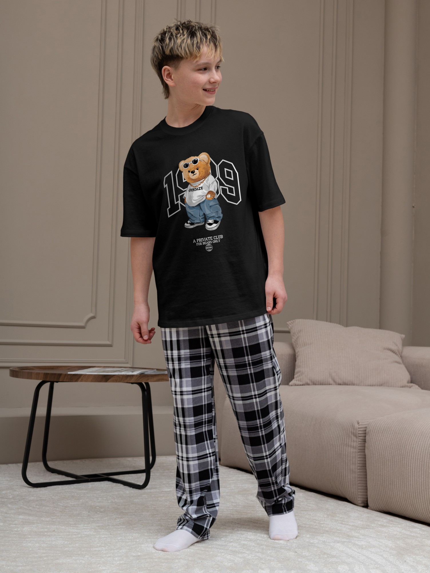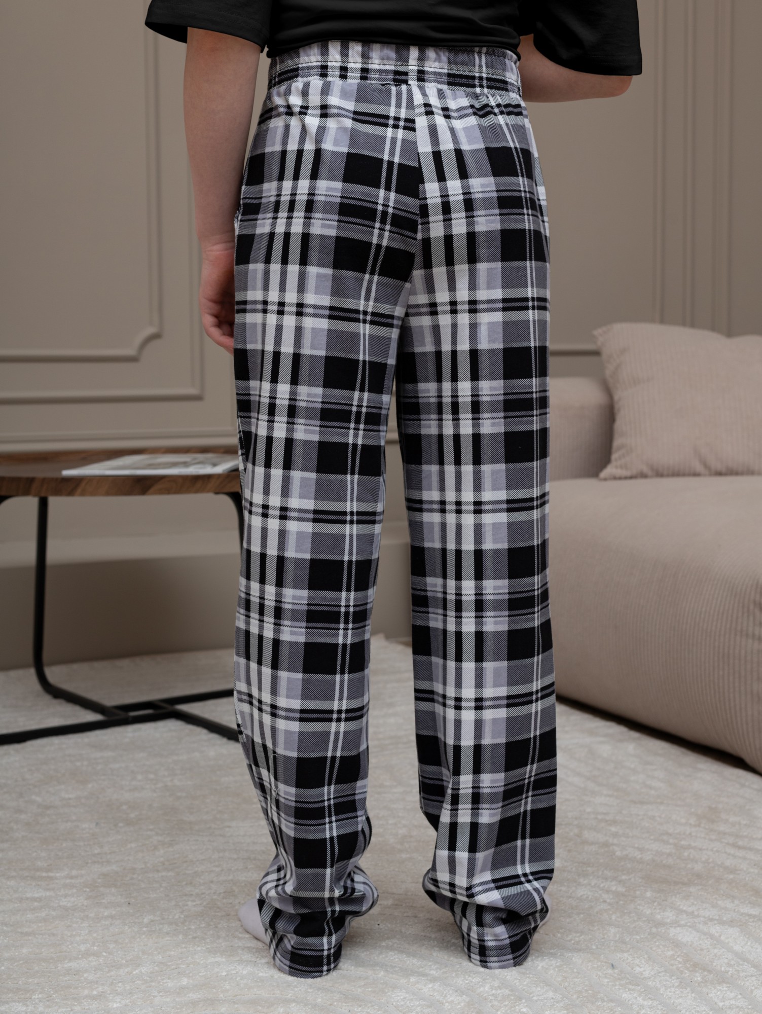 Костюм для мальчика, состоящий из футболки и брюк. Футболка однотонная с принтом на груди; модель свободная, со спущенной линией плеч, втачными короткими рукавами и овальным вырезом горловины. Брюки из полотна с набивным рисунком эксклюзивного дизайна, прямые, с боковыми карманами с обтачными входами, на притачном поясе с отстроченной эластичной тесьмой.