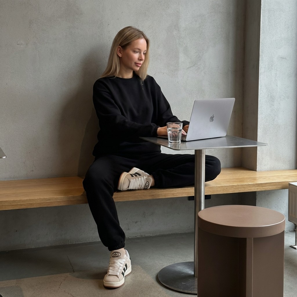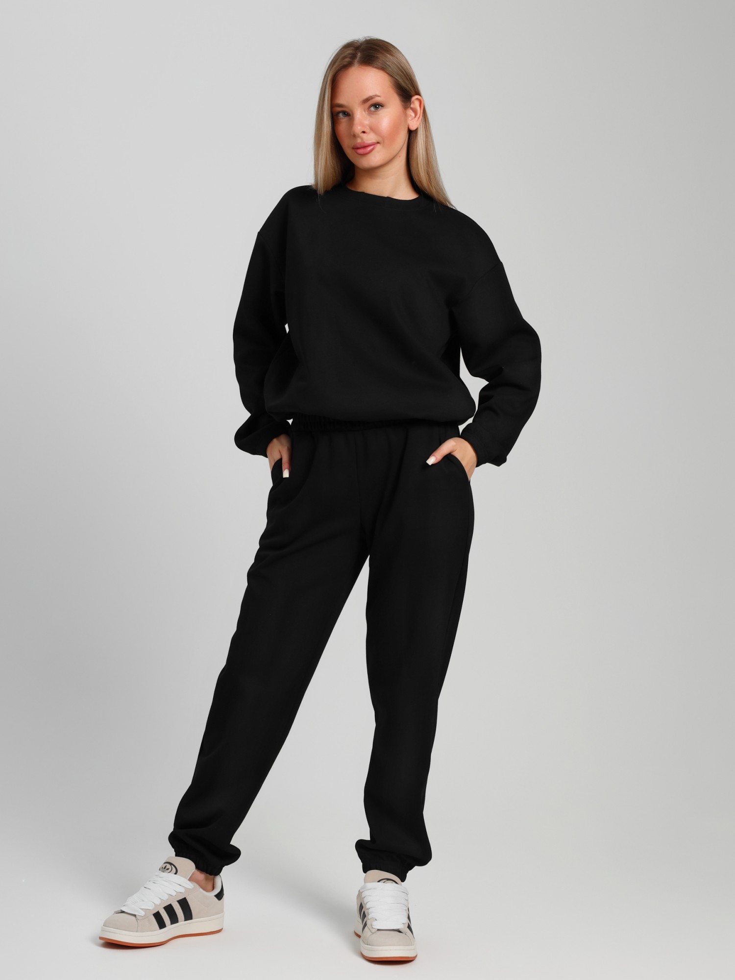 Костюм молодежный из гладкокрашенного трикотажного полотна «лининг», состоящий из джемпера и брюк. Джемпер – свободного покроя, с длинными втачными рукавами, горловиной овальной формы, обработанной втачной планкой, состоящей из двух частей. Окантованные нижние срезы рукавов, планка горловины и пояс из полотна «кашкорсе» такого же цвета, как и основной материал. Притачной пояс выполнен с вложением эластичной тесьмы, регулируемой по длине фиксаторами.Брюки – длинные, с карманами в боковых швах, на притачном поясе с эластичной тесьмой внутри, в левом боковом шве вставлен декоративный элемент. Нижние срезы обработаны подгибкой с вложением эластичной тесьмы.