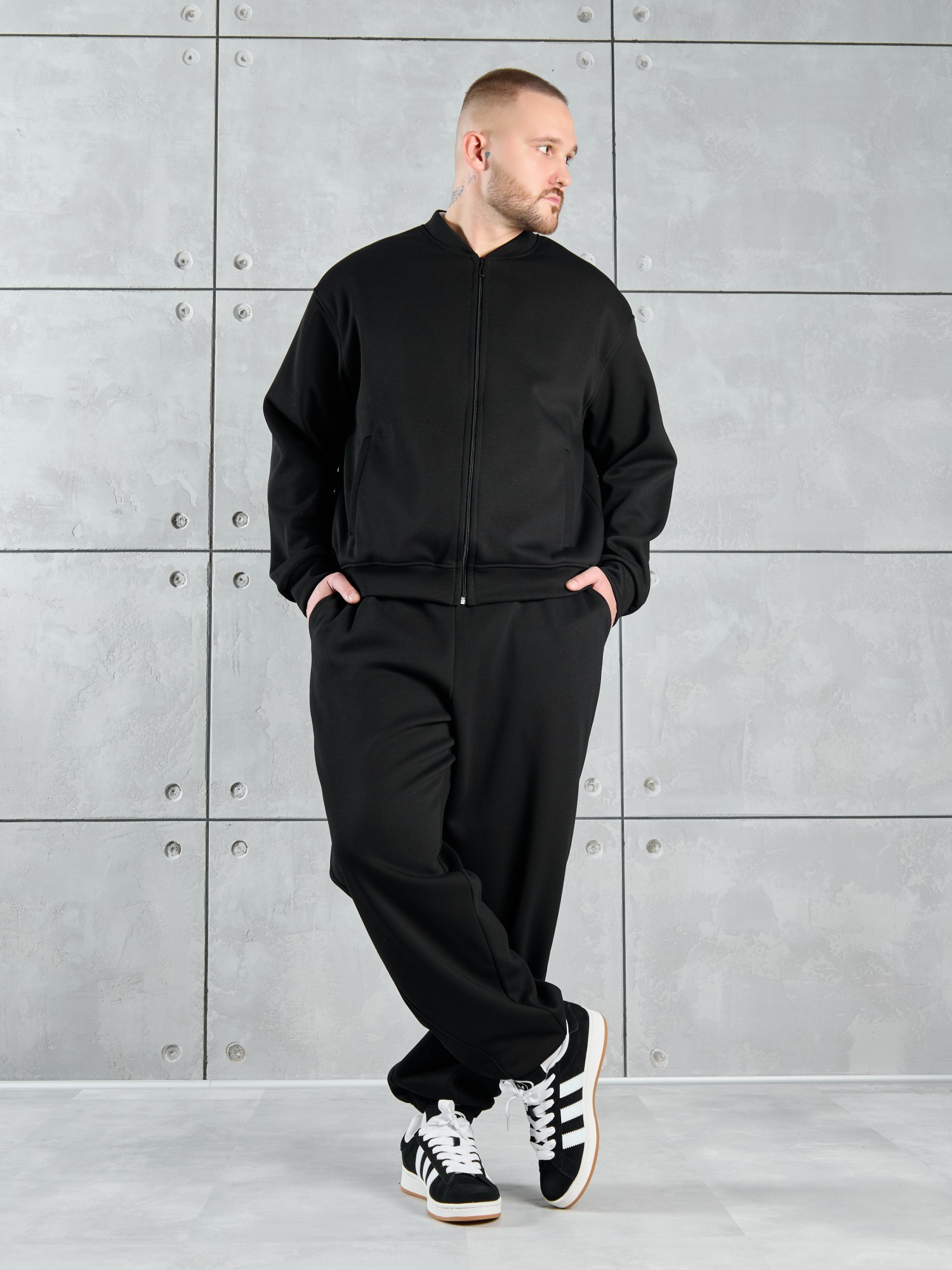 Костюм мужской из трикотажного полотна "лининг", состоящий из бомбера и брюк. Бомбер - с длиннми втачными рукавами с притачными манжетами, прорезными карманами с листочками на полочках, центральной бортовой застежкой на тесьму "молния", втачным воротником-стойкой с закругленными концами и притачным поясом по низу. По шву притачивания пояса и проймам настрочены отделочные строчки. Брюки - свободного покроя, со смещенными к центрам передних половин боковыми швами, карманами в боковых швах и притачным поясом с эластичной тесьмой внутри. Нижние срезы обработаны подгибкой с эластичной тесьмой. Для регулирования степени прилегания изделия по талии предусмотрен шнурок, вставленный через две обметанные петли в центре пояса спереди.