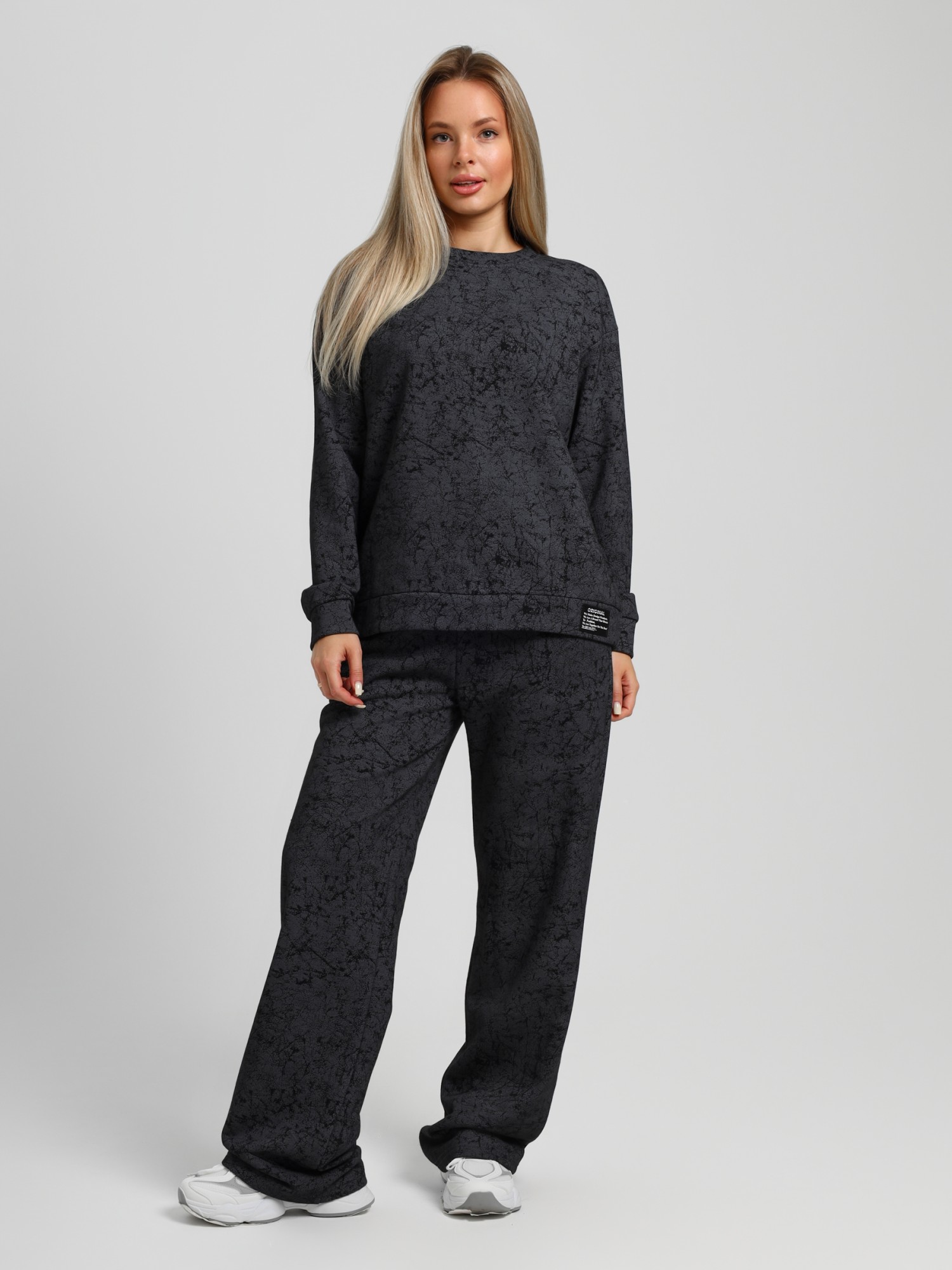 Костюм молодежный из трикотажного полотна футер трехнитка с «эффектом замши», состоящий из джемпера и брюк. Джемпер – прямого силуэта, с длинными втачными рукавами, горловиной овальной формы, обработанной втачной планкой. Рукава с манжетами, низ - с притачным поясом, дополненным декоративным элементом-нашивкой.Брюки – длинные, свободные, на притачном поясе с эластичной тесьмой внутри, карманами в боковых швах.