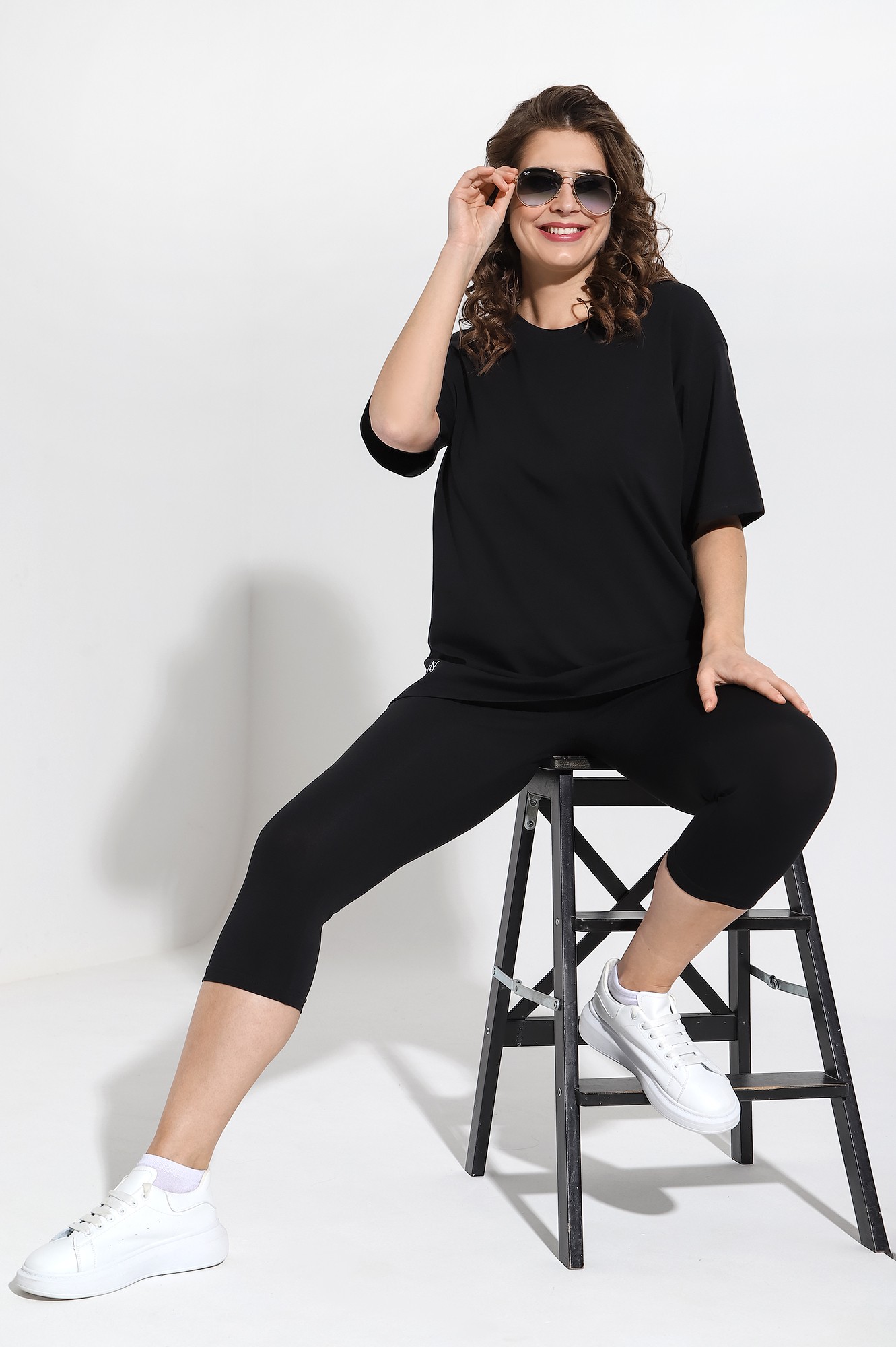 Костюм женский из трикотажного гладкокрашенного полотна «кулирка с лайкрой», состоящий из футболки и бридж. Футболка свободного покроя, со спущенным плечом и втачными рукавами длиной до локтя, горловиной овальной формы, обработанной втачной планкой и принтом на полочке, выполненным в технике «шелкографии». В нижней части боковых швов – разрезы.Бриджи – классического покроя, на резинке.