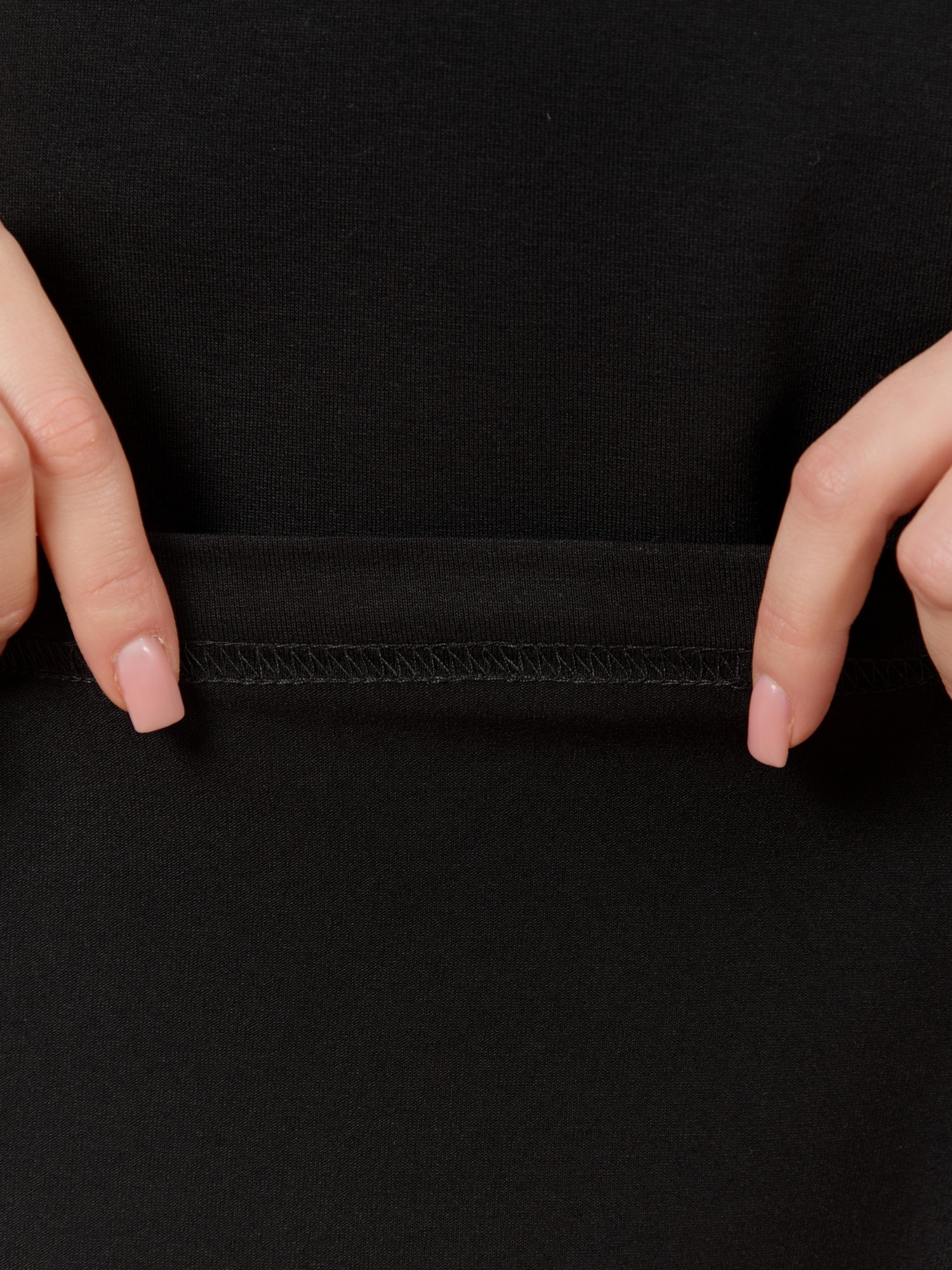 Сорочка молодежная из гладкокрашеного трикотажного вискозного полотна на узких бретелях, полуприталенного силуэта, слегка расширенная книзу. V-образная горловина полочки и спинки отделана кружевными вставками треугольной формы. Проймы окантованы основным материалом.