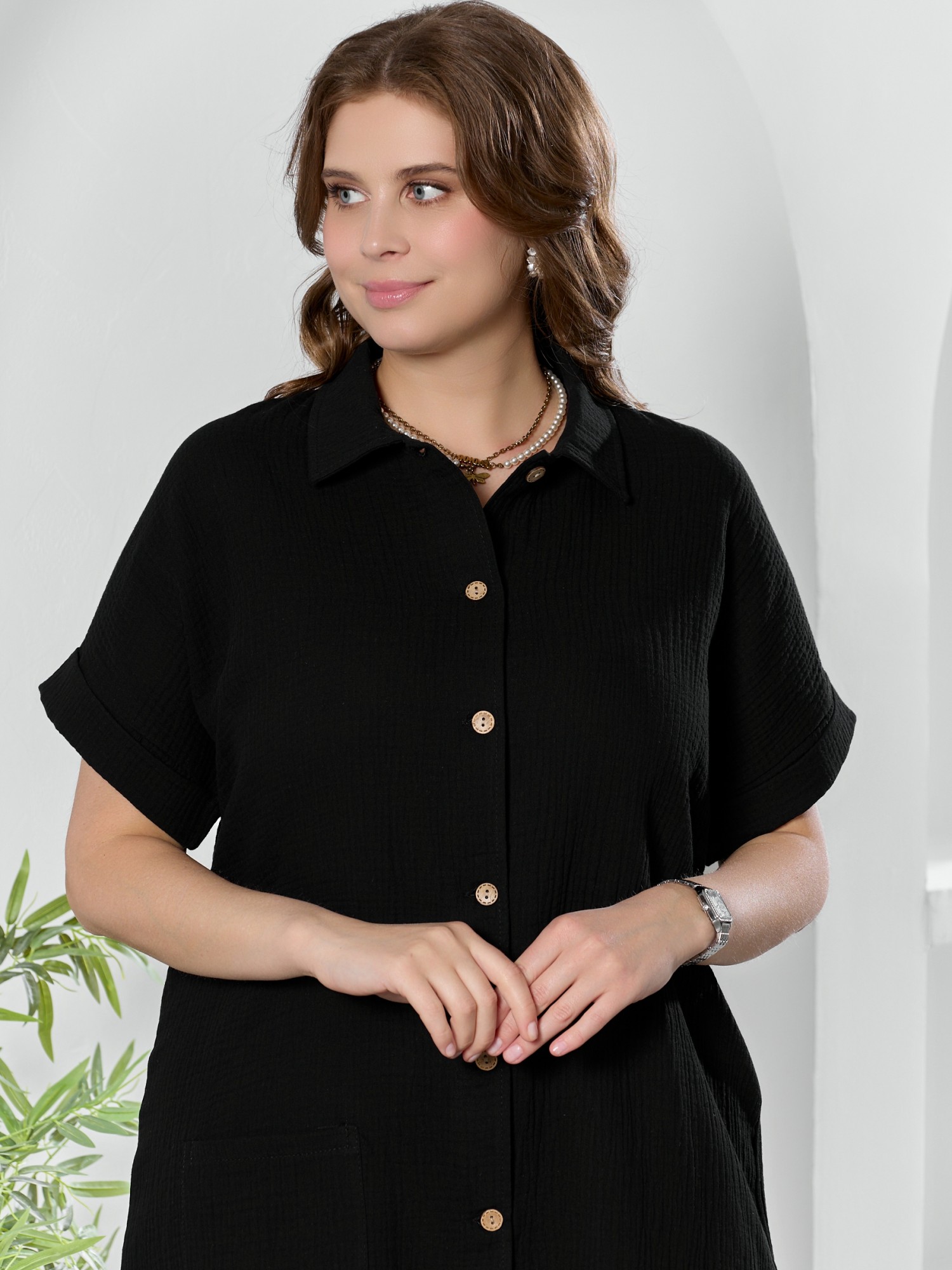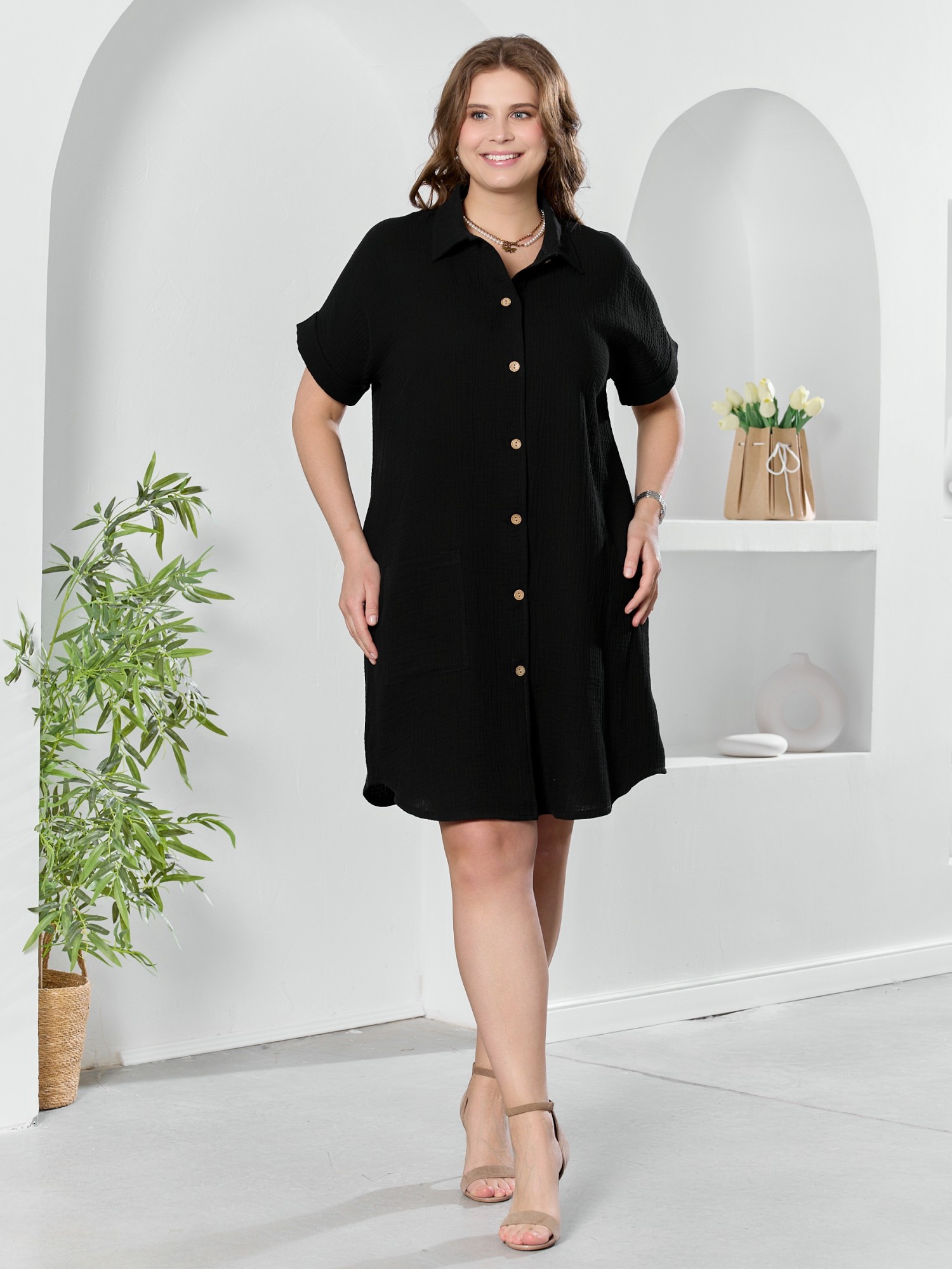 Платье женское из гладкокрашеного тканого полотна «муслин», полуприлегающего силуэта, длиной до колен, с короткими цельнокроеными рукавами, низ которых обработан манжетами, стояче-отложным воротником, центральной бортовой застежкой на петли и пуговицы, фигурной линией низа. На правой полочке в области бедер настрочен накладной карман.