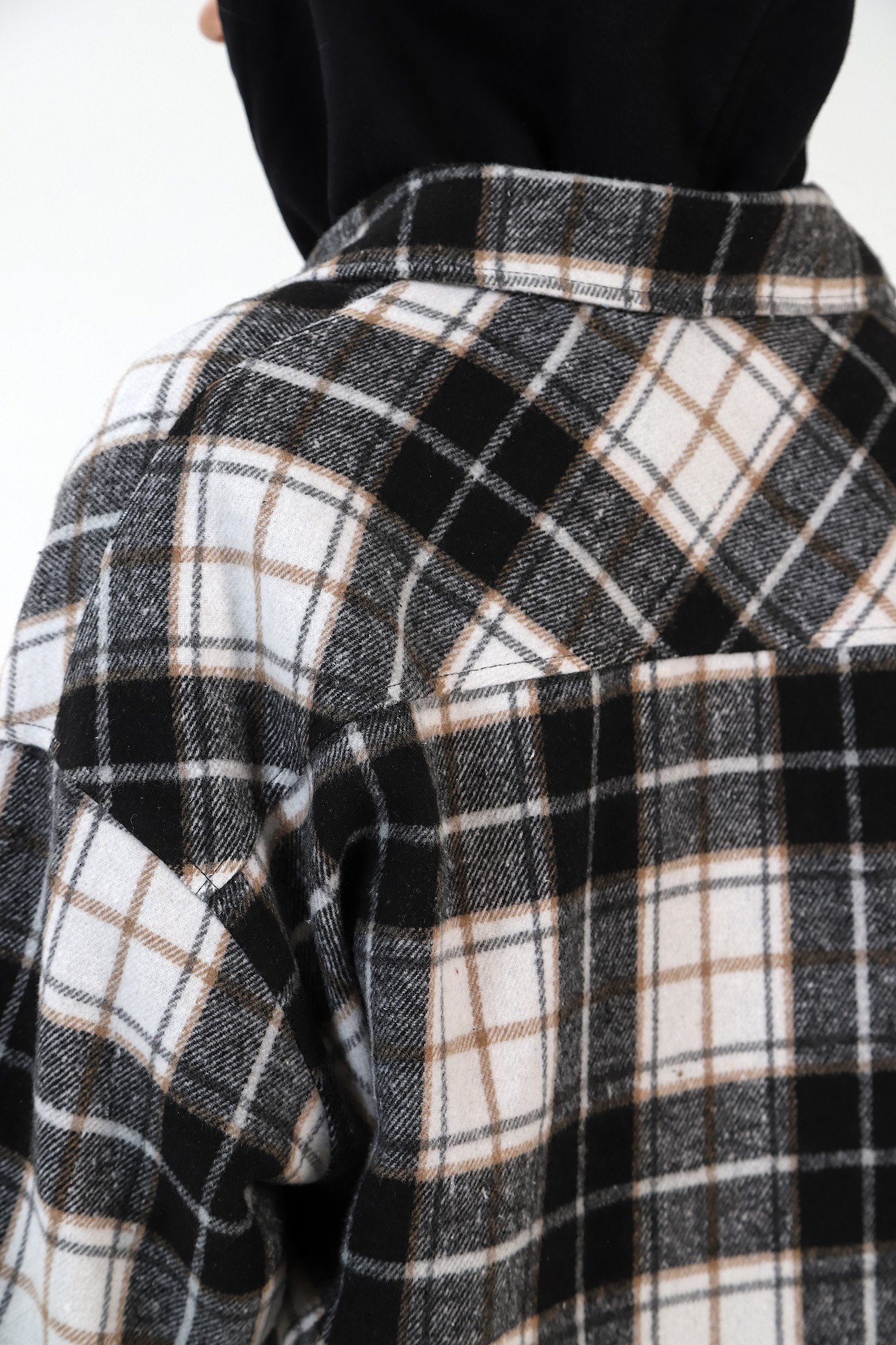 Рубашка женская из тканого полотна с рисунком в крупную клетку, длинными втачными рукавами с разрезами на притачных манжетах, застегивающимися на обметанные петли и пуговицы, фигурной линией низа и стояче-отложным воротником. Полочки - с двумя нагрудными карманами и клапанами фигурной формы. Спинка - с притачной кокеткой, выкроенной по косой. В швах соединения манжет с рукавами обработаны по одной складочке. При эксплуатации изделия следует обратить внимание на то, что после ВТО и стирки материал дает усадку по ширине и длине.