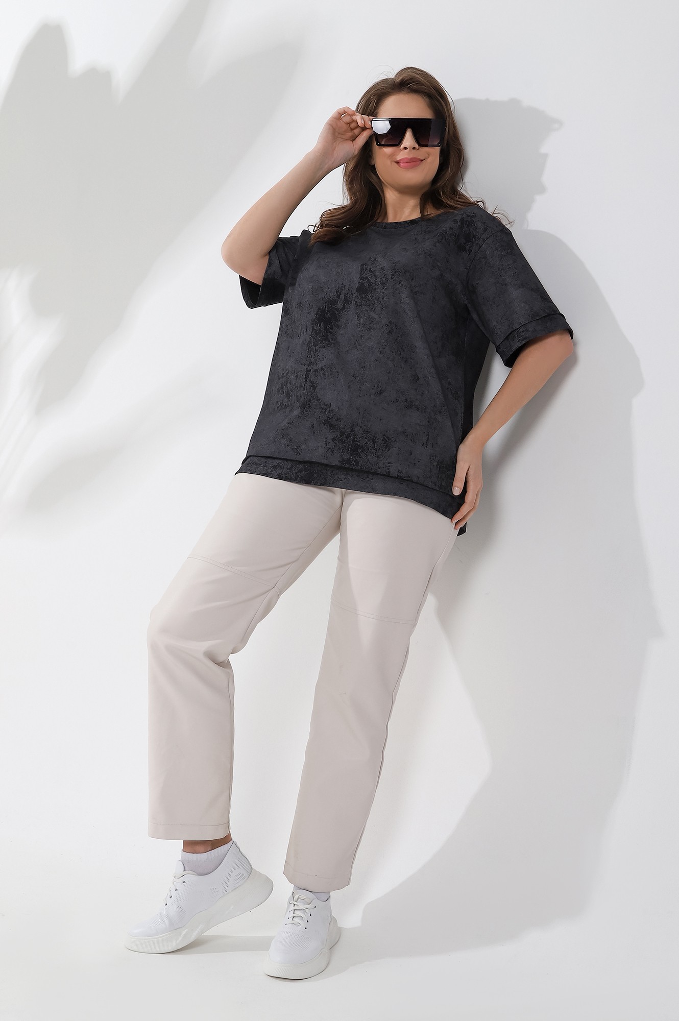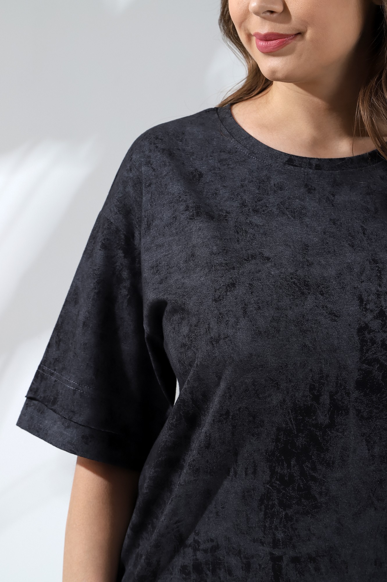 Футболка из гладкокрашеного трикотажного полотна «кулирка» с эффектом «варенки», свободного покроя, горловиной овальной формы, обработанной притачной планкой. Низ рукавов и изделия состоит из двух частей, одна из которых с необработанным краем, другая с подгибкой и соединенных между собой накладным швом.