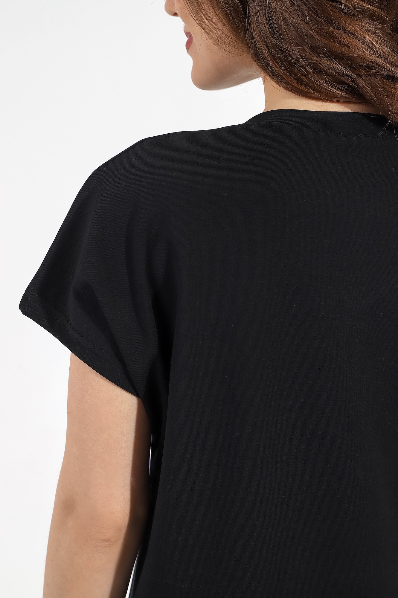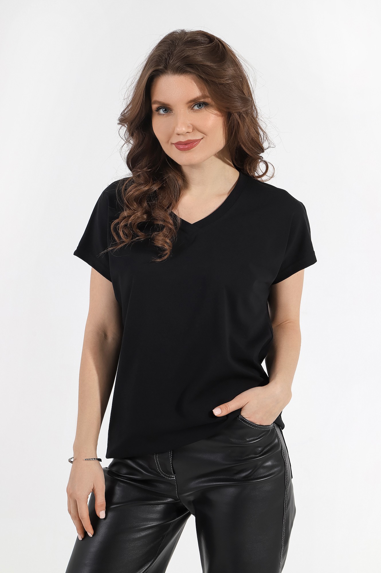 Футболка женская из трикотажного гладкокрашеного полотна «кулирка» с лайкрой, классического покроя, с короткими втачными рукавами и горловиной овальной формы, обработанной втачной планкой.