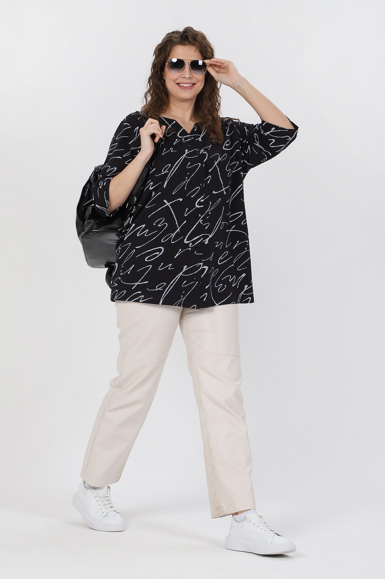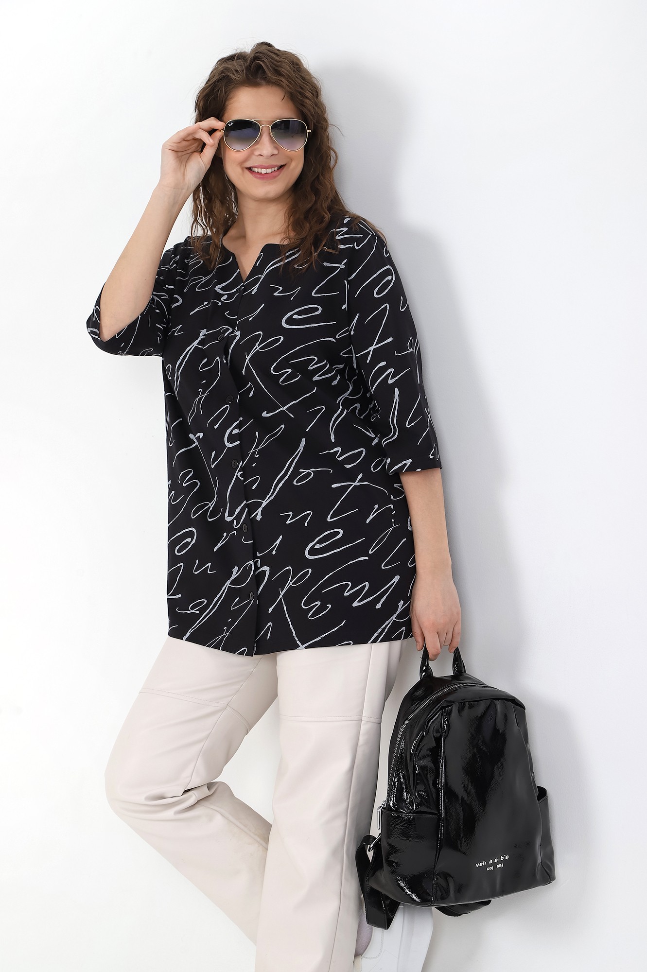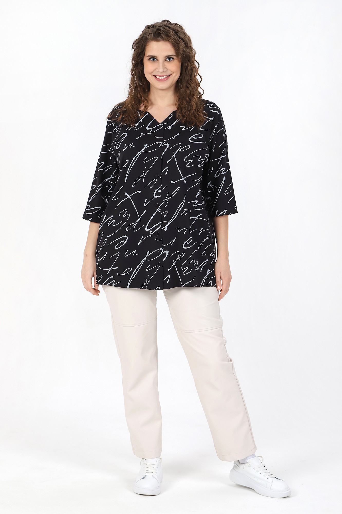 Блуза женская свободного покроя, из трикотажного полотна «кулирка», с рукавами ¾ длины, центральной бортовой застежкой на петли и пуговицы. V-образная горловина переда обработана обтачками, спинки – окантована.