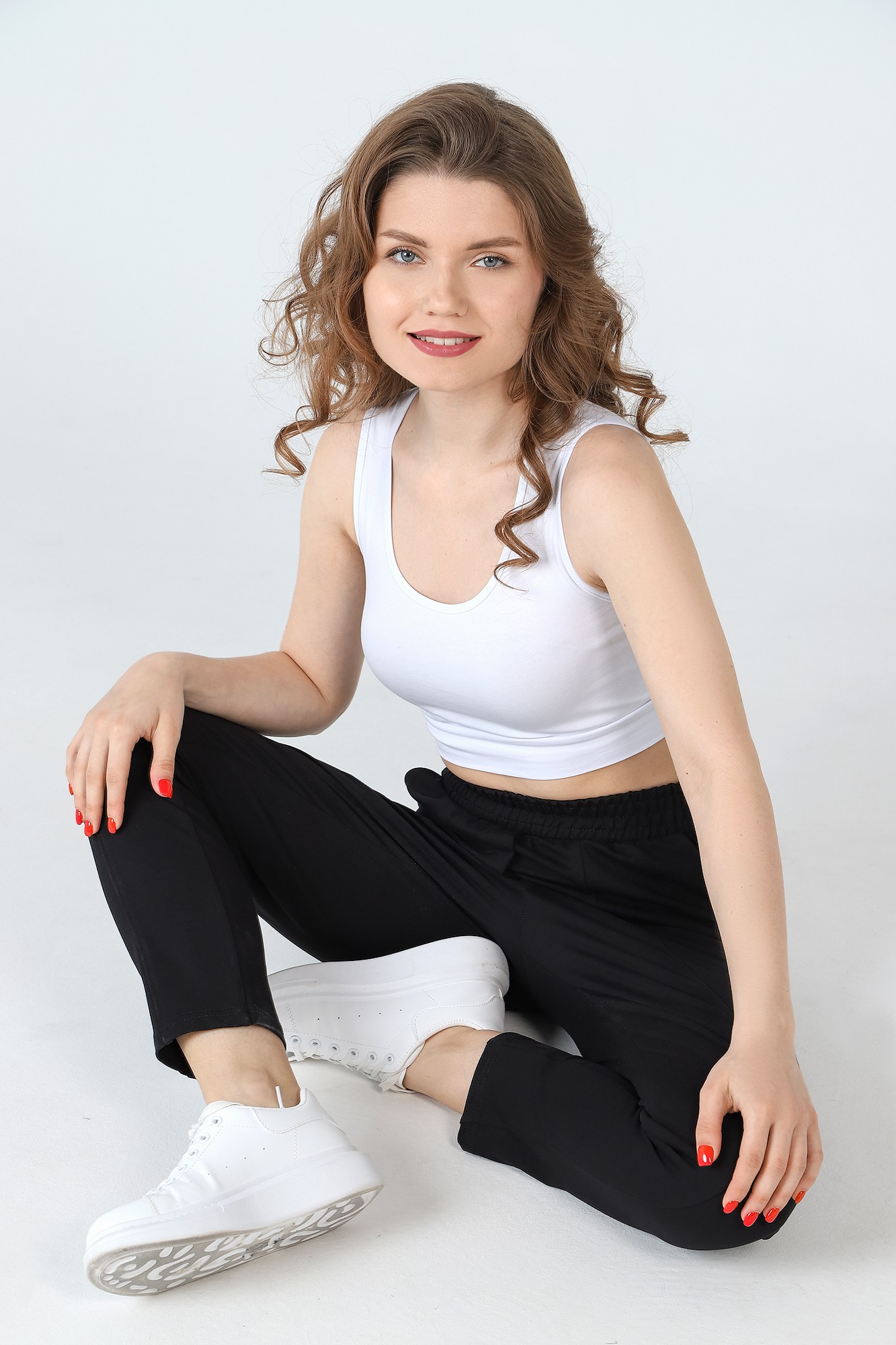 Брюки из трикотажного полотна «футер-двухнитка», слегка зауженные книзу, на притачном поясе с эластичной тесьмой внутри и карманами в боковых швах. Средний шов переда выполнен с имитацией застежки «гульфик». Передние половины - разрезные по линиям центра, а по швам стачивания выполнены отделочные строчки.