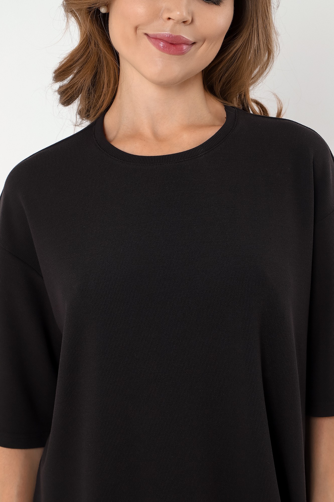 Костюм женский из гладкокрашенного трикотажного полотна в рубчик («лапша»), состоящий из футболки и леггинсов. Футболка – удлиненная, свободного покроя, со спущенной, линией плеча, короткими втачными рукавами, горловиной овальной формы, обработанной втачной планкой.Леггинсы – длиной до колен, с эластичной тесьмой по талии.