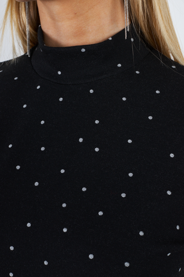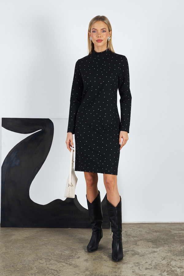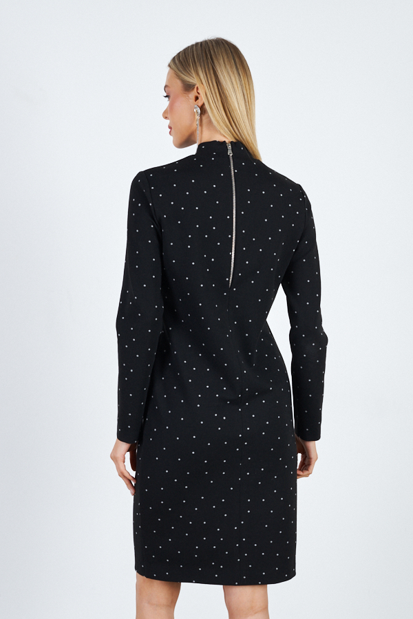 Платье из эластичного полотна с жаккардовым узором "горох". Изделие прилегающего силуэта с длинным втачным рукавом. Воротник-стойка. По среднему шву спинки застежка-молния.